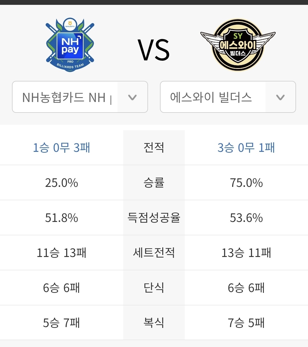 에스와이 빌더스 vs NH농협카드 프로 당구팀 경기 결과