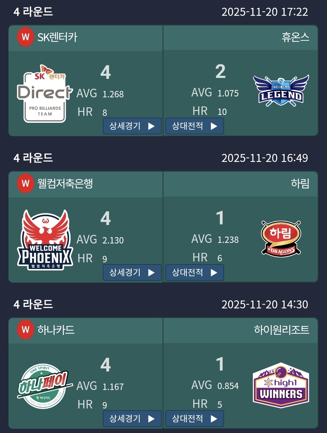 | PBA팀리그 4라운드 4일차 경기결과와 팀 순위 (프로당구 2025-26 시즌) (0) | 2025.11.20 |