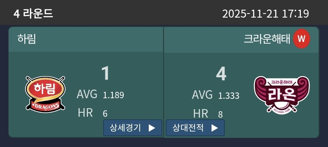 이번 승리로 크라운해태는 4라운드 상위권 도약의 발판을 마련했습니다. 반면 하림은 패배와 함께 4라운드 순위표 하단을 벗어나지 못하며 여전히 하위권 탈출에 어려움을 겪고 있는 모습입니다.