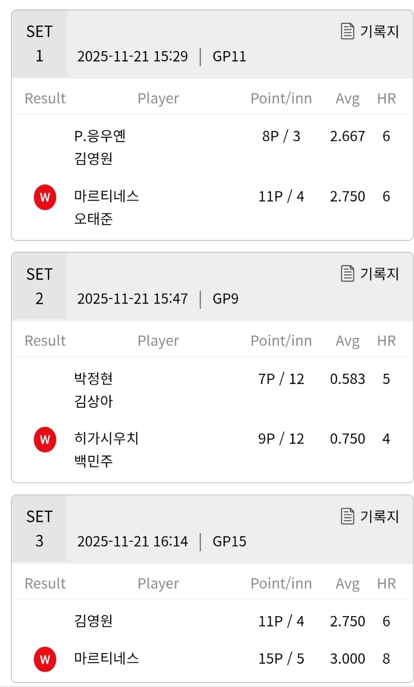 3세트 남자 단식에서도 마르티네스의 존재감이 빛났습니다. 하림의 김영원 선수가 4이닝 동안 11점을 기록하며 선전했지만, 마르티네스는 5이닝 동안 15점을 생산하며 에버리지 3.000, 하이런 8점이라는 압도적인 기록으로 승리를 가져갔습니다. PBA 랭킹 1위다운 집중력과 해결 능력이 그대로 드러난 순간이었습니다.