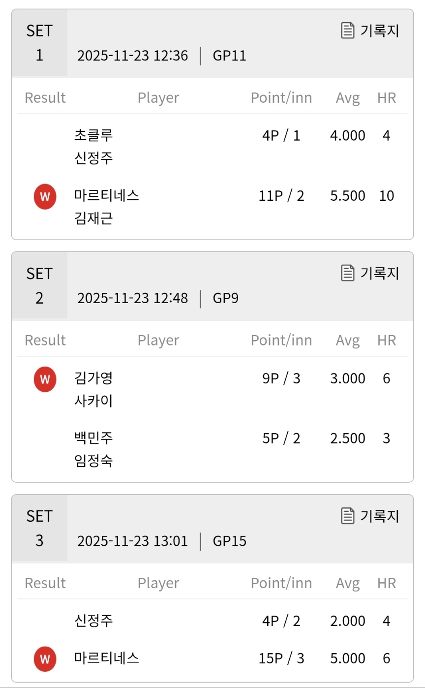 하나카드 VS 크라운해태 당구팀 세트별 경기 내용