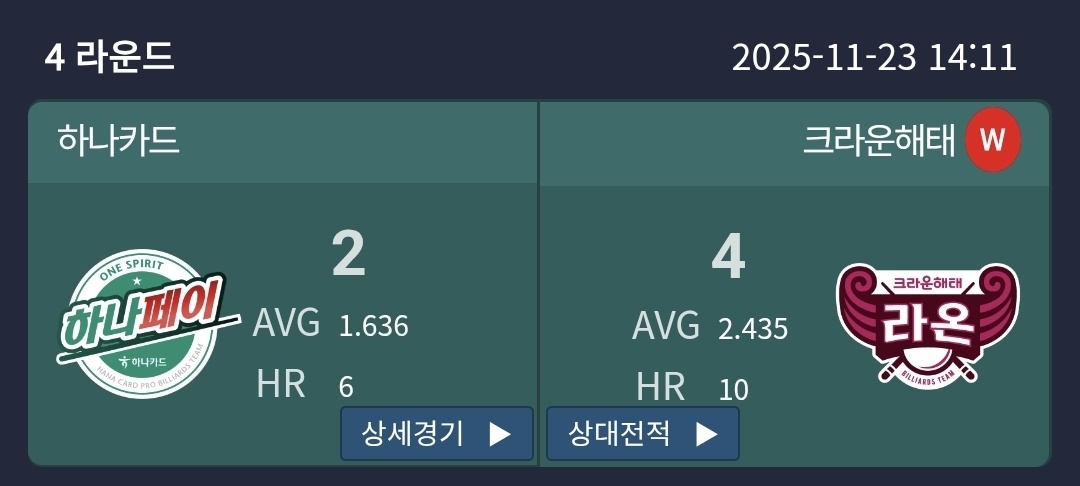 11월 23일에는 PBA 팀리그 4라운드 8일차에서 중요한 상위권 맞대결이 펼쳐졌습니다. 7일차 기준으로 크라운해태 라온은 4라운드 2위, 하나카드 하나페이는 3위에 자리하고 있어, 이번 승부 결과에 따라 라운드 우승 경쟁에 큰 변화가 올 수 있는 날이었습니다. 특히 크라운해태는 이날 승리한다면 1위 자리까지 넘볼 수 있는 절호의 기회를 맞았고, 하나카드는 상위권 수성을 위해 반드시 승리가 필요했습니다.