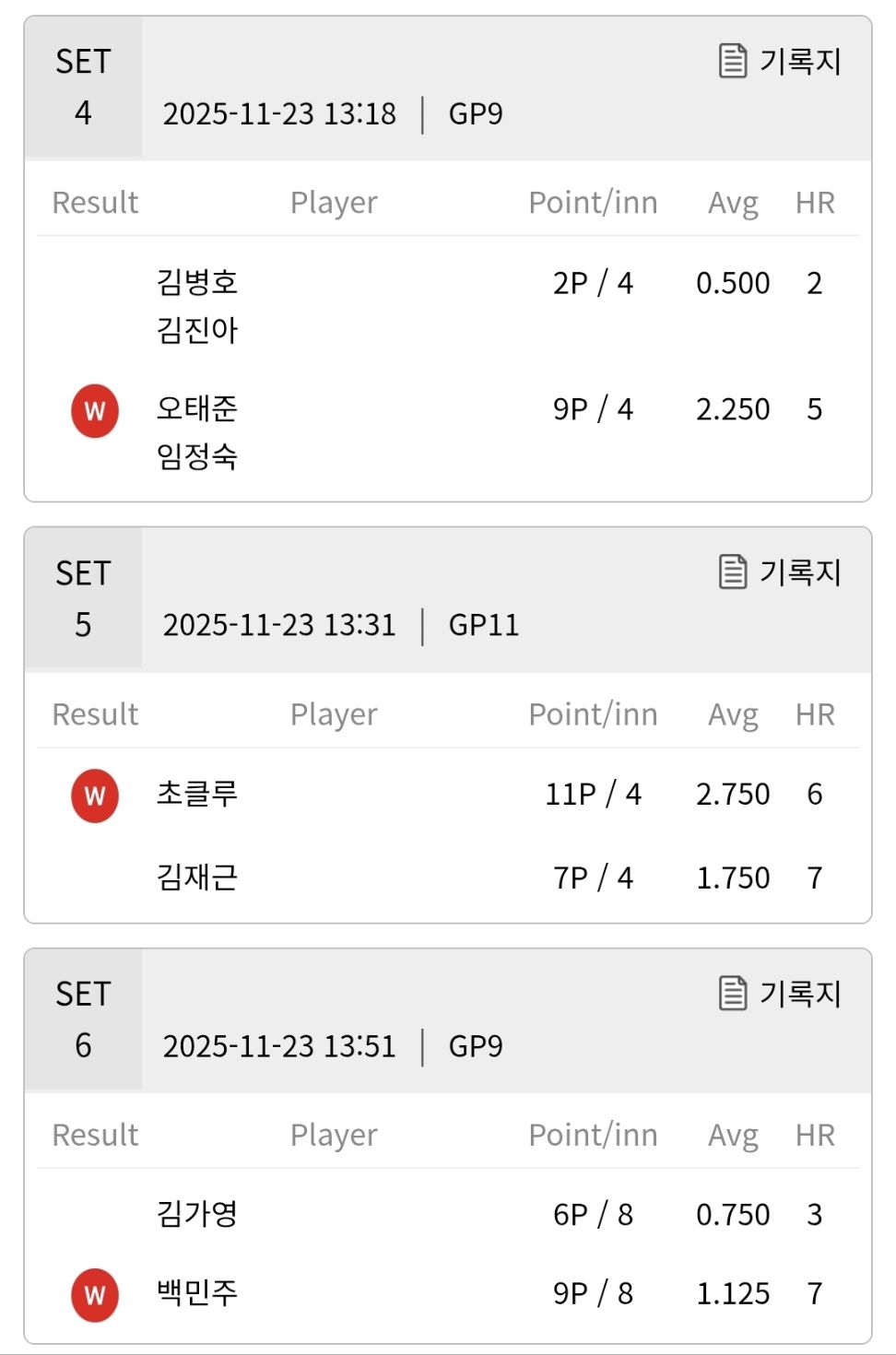하나카드 VS 크라운해태 당구팀 세트별 경기 내용