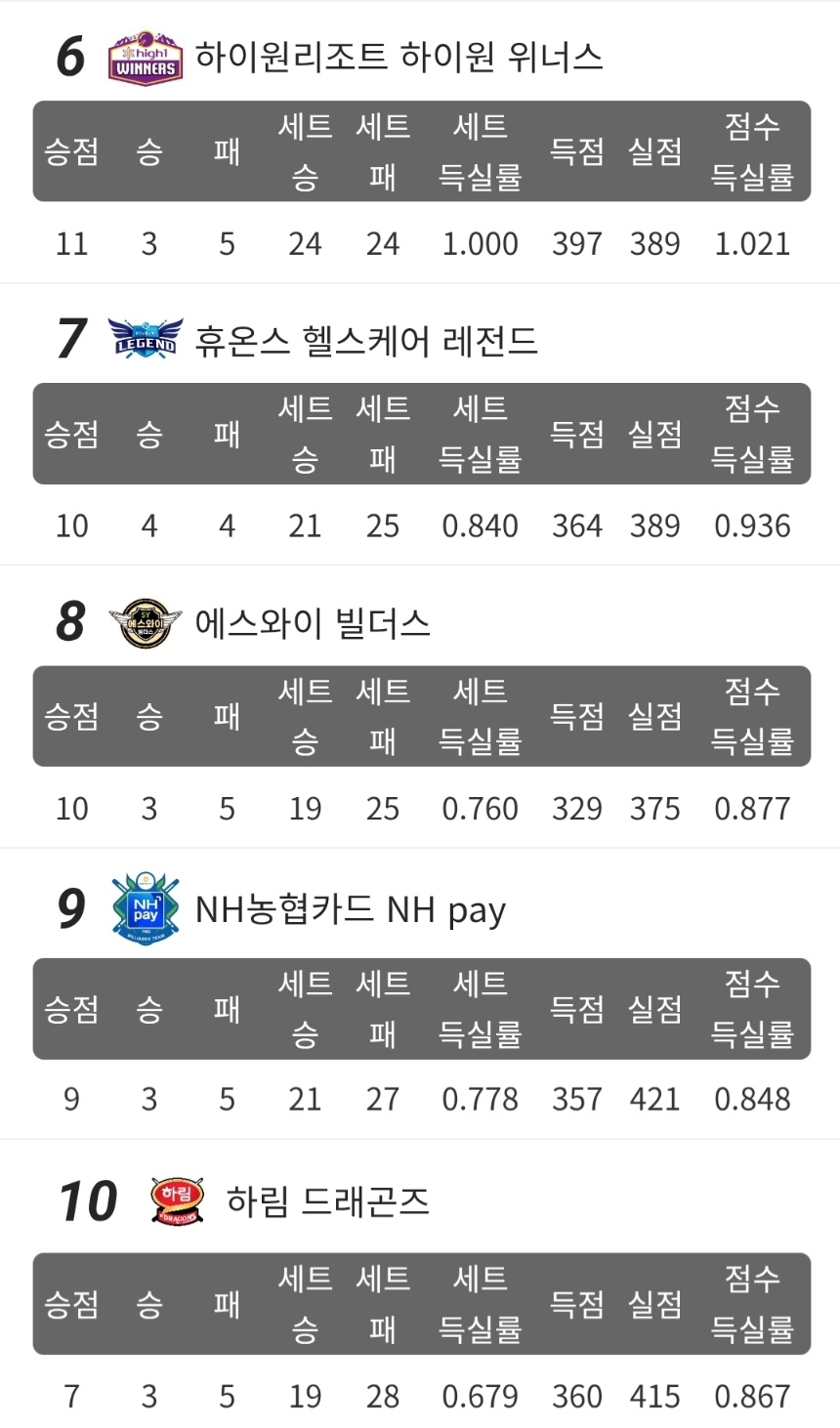 이와 함께 NH농협카드는 SK렌터카를 4대 3으로 잡아내며 하위권 탈출의 중요한 발판을 마련했습니다. 에스와이 빌더스 역시 휴온스를 꺾고 8일차 승리를 기록해 중위권 경쟁에 다시 불을 지폈습니다.