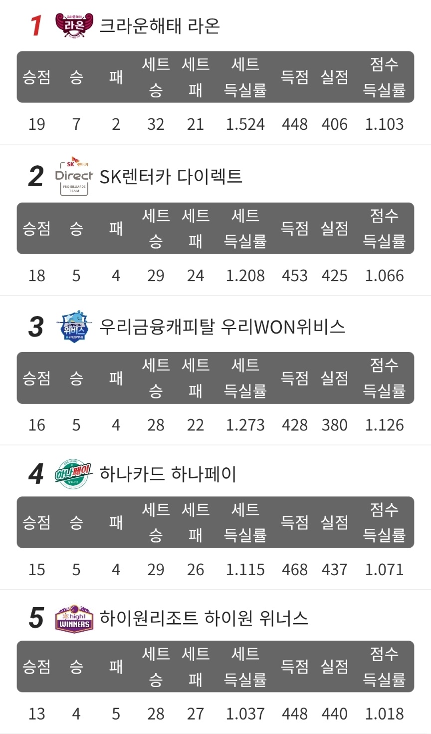 2위는 SK렌터카 다이렉트가 차지했습니다. 마지막 날 패배로 역전 우승에는 실패했지만, 전체 승점과 세트 득실에서 여전히 강팀의 면모를 보여 주었습니다. 3위에는 우리금융캐피탈 우리WON위비스가 올랐고, 하나카드 하나페이와 하이원리조트 하이원 위너스가 그 뒤를 이었습니다.