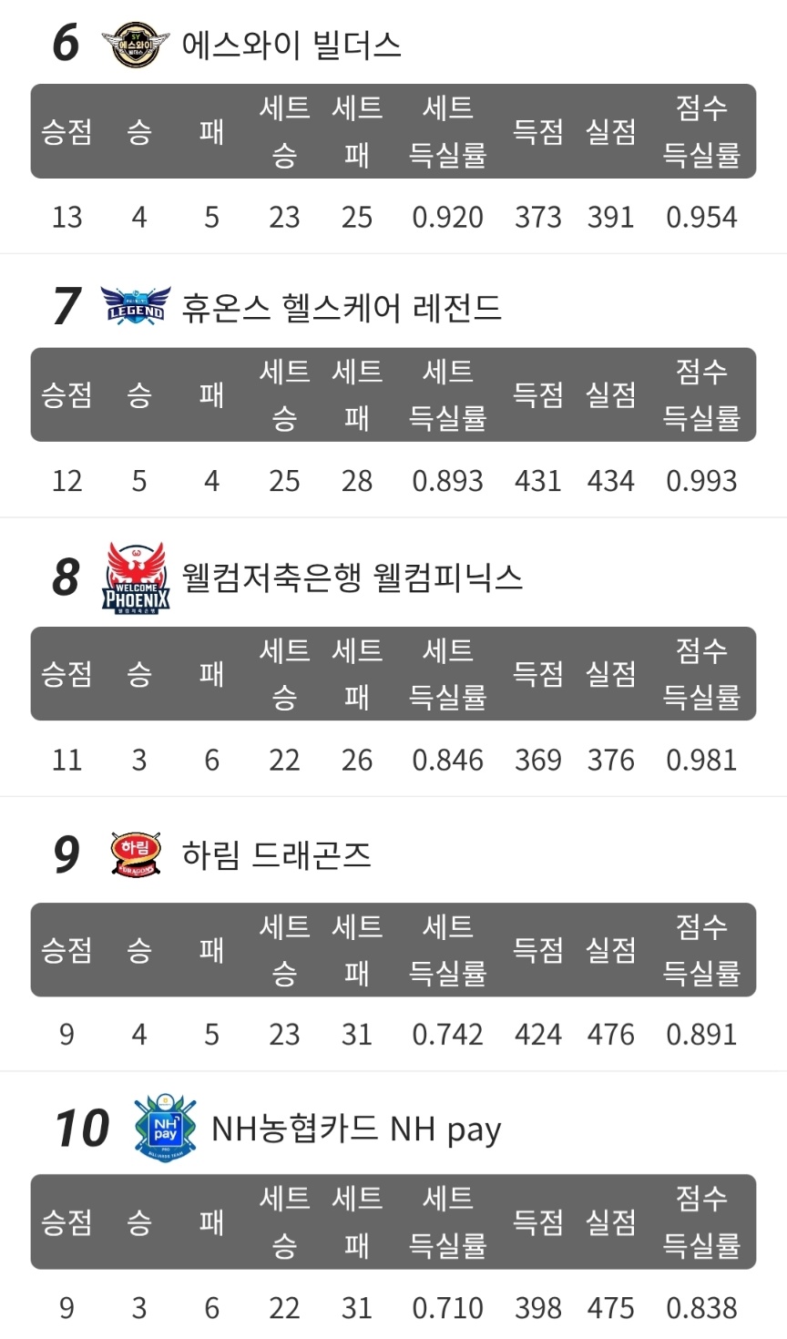 이들 팀은 언제든 상위권 도약을 노릴 수 있는 전력으로 다음 라운드에서도 치열한 경쟁을 이어갈 전망입니다. 중위권에서는 에스와이 빌더스와 휴온스 헬스케어 레전드, 웰컴저축은행 웰컴피닉스가 자리했습니다. 특히 휴온스는 9일차에서 크라운해태를 상대로 승리를 거두며, 성적 이상의 의미를 가진 큰 수확을 얻었습니다.