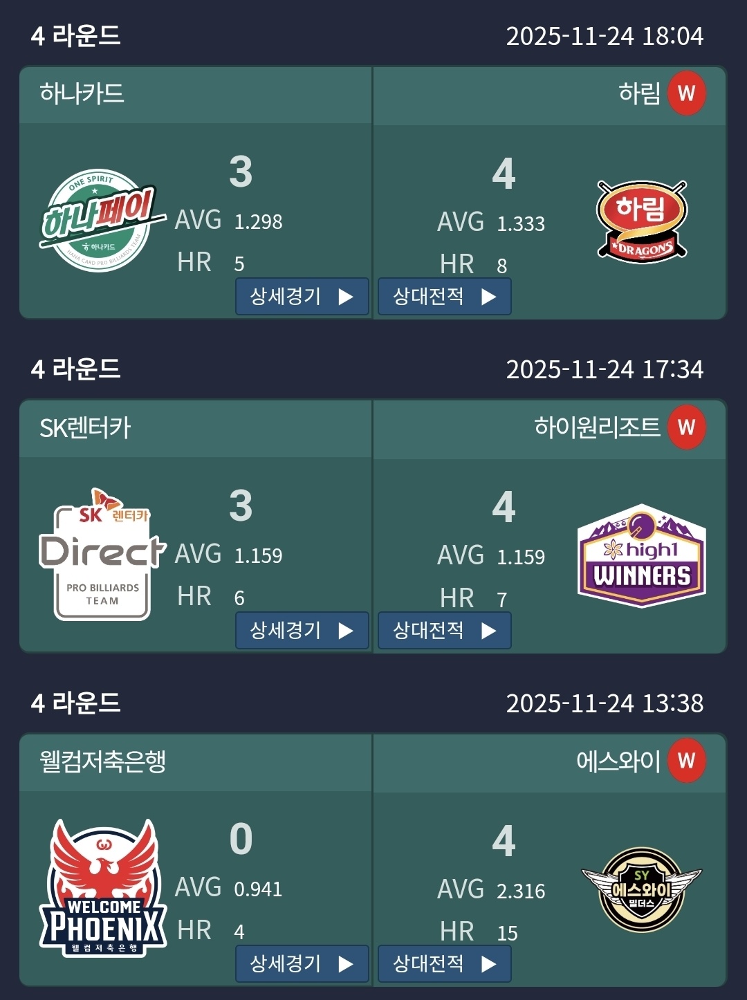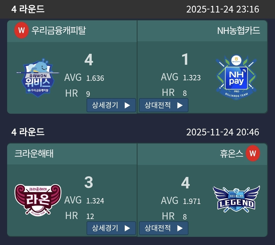 | PBA 팀리그 4라운드 8일차 경기결과 – 크라운해태 라온 vs 하나카드 당구팀(프로당구 2025-26) (0) | 2025.11.23 |