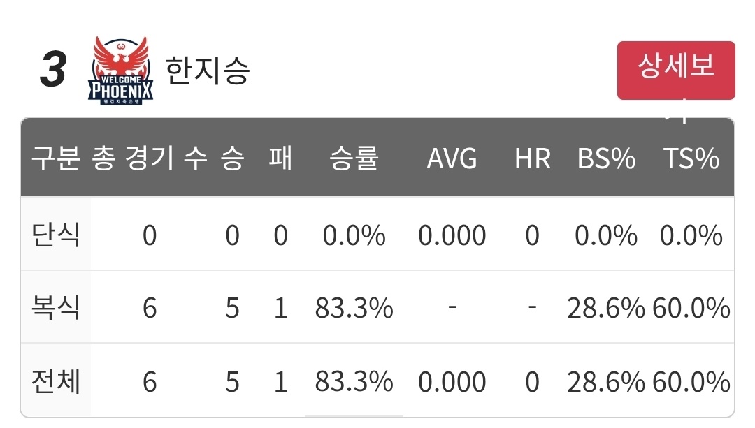 복식 세부 기록을 살펴보면 6경기 5승 1패, BS% 28.6%, TS% 60.0%로 집계됩니다. BS% 수치에서 보이듯이 뱅크 샷을 적극적으로 활용하면서도, 득점 성공률 60%라는 안정적인 지표를 유지해 파트너에게 신뢰를 주는 유형의 선수입니다. 전체 지표 역시 동일하게 승률 83.3%, AVG 0.000, HR 0점으로 표기되지만, 실제 경기 내용에서는 중요한 순간마다 득점과 수비를 번갈아 수행하며 웰컴피닉스의 4라운드 후반 상승세를 이끄는 조력자로 활약했습니다.