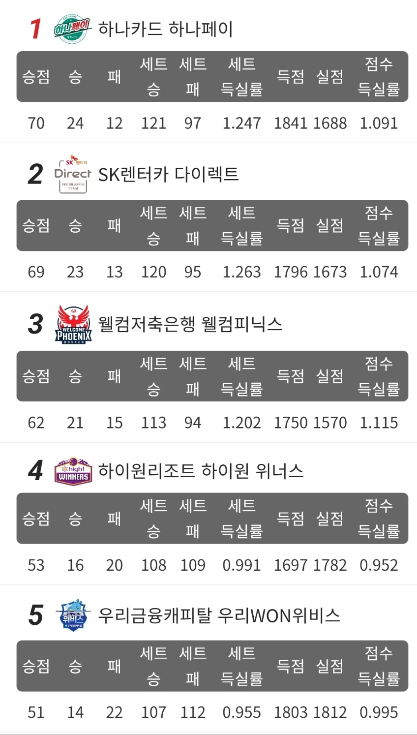 2위는 승점 69점의 SK렌터카 다이렉트입니다. 23승 13패, 세트 120승 95패로 세트 득실률이 1.263에 달하며, 득점 1796점, 실점 1673점으로 점수 득실률 또한 1.074를 기록해 언제든지 1위 자리를 위협할 수 있는 추격자 역할을 하고 있습니다. 3위 웰컴저축은행 웰컴피닉스는 승점 62점, 21승 15패, 세트 113승 94패, 세트 득실률 1.202, 득점 1750점과 실점 1570점으로, 상위 두 팀과 함께 ‘3강 구도’를 형성하며 포스트시즌 직행을 노리고 있습니다.