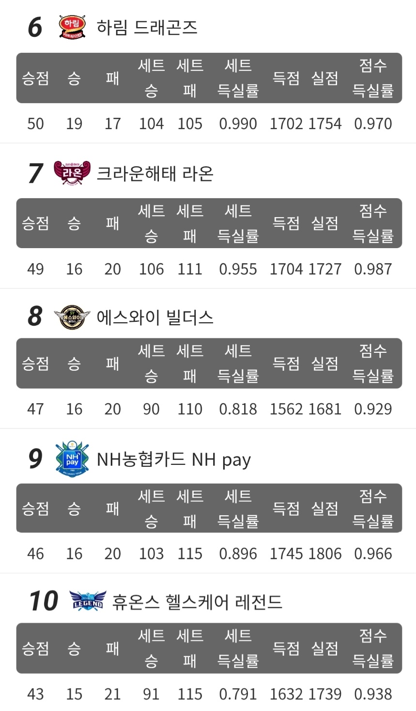 8위 에스와이 빌더스는 승점 47점, 16승 20패, 세트 90승 110패로 세트 득실률이 0.818에 그치고 있으며, 득점 1562점, 실점 1681점으로 점수 득실률 0.929를 기록 중입니다. 9위 NH농협카드 NH pay는 승점 46점, 16승 20패, 세트 103승 115패, 득점 1745점, 실점 1806점, 점수 득실률 0.966을 기록하며 5라운드 대반전을 통한 순위 상승을 노려야 하는 입장입니다.