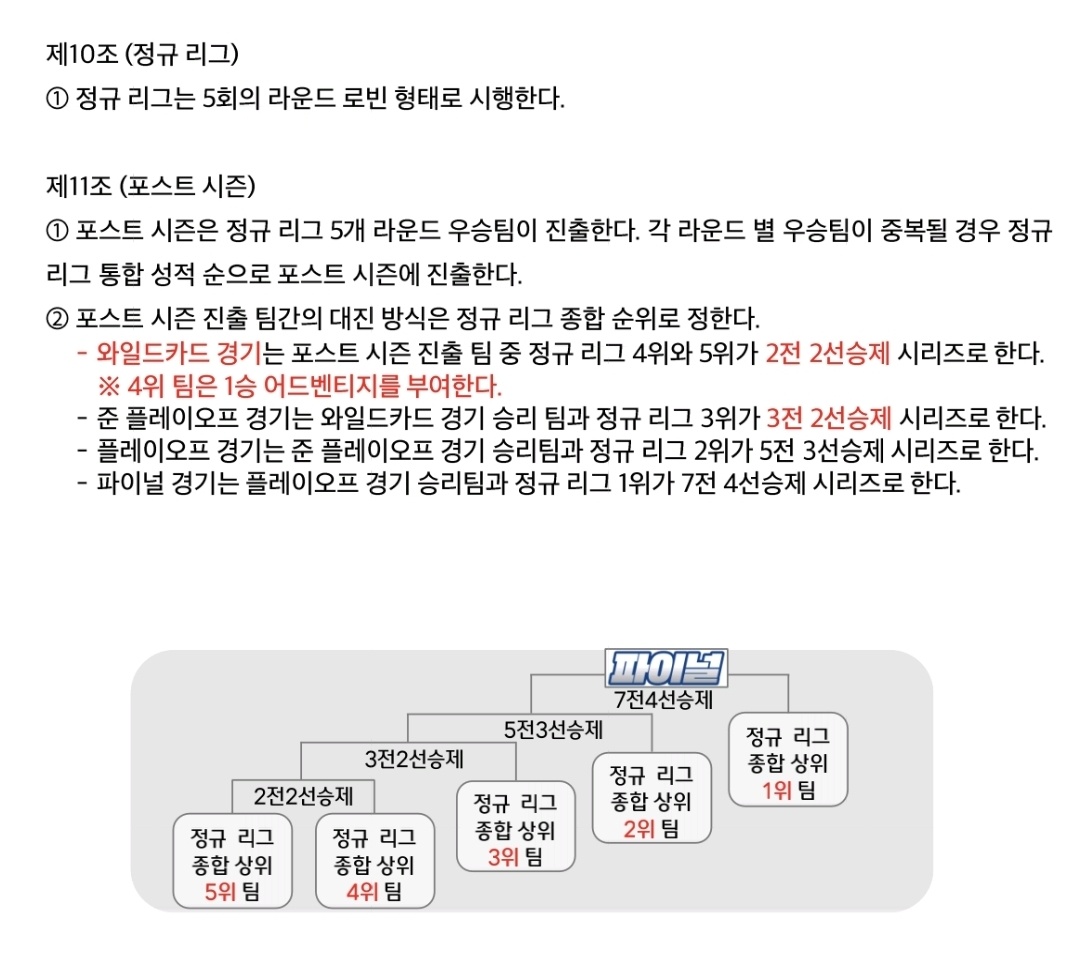 포스트시즌에는 총 5개 라운드의 우승팀이 진출합니다. 다만 한 팀이 여러 라운드에서 중복 우승을 차지한 경우에는 정규리그 종합 순위 상위 팀이 대신 포스트시즌 티켓을 가져가게 됩니다. 이렇게 구성된 포스트시즌 진출 팀들은 정규리그 종합 순위를 기준으로 와일드카드, 준플레이오프, 플레이오프, 파이널로 이어지는 토너먼트를 치르게 됩니다.