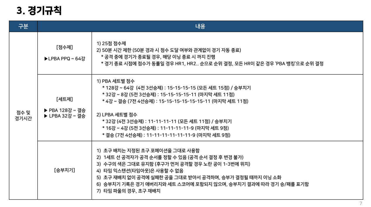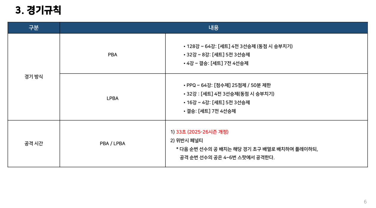 PBA는 128강부터 64강까지 4전 3선승제, 32강부터 8강까지 5전 3선승제, 4강부터 결승까지는 7전 4선승제로 진행됩니다. LPBA는 예선에서 점수제로 운영되며, 32강부터는 세트제가 적용됩니다. 특히 이번 시즌부터 PBA와 LPBA 모두 공격 시간이 33초로 단축되어 선수들의 속도감 있는 전개가 요구됩니다. 승부치기 규정, 초구 포메이션, 타임아웃 규정 또한 대회 규정에 따라 세밀하게 적용됩니다.