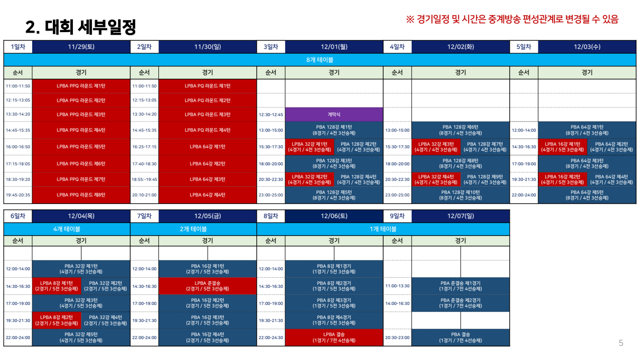 대회는 총 9일간 진행되며 LPBA 예선 라운드(PPQ·PQ), PBA 128강·64강 일정, 그리고 양 투어의 본선 및 결승전으로 구성됩니다. 중계방송 편성에 따라 경기 시간이 일부 변동될 수 있으며, 결승전은 LPBA가 12월 6일, PBA가 12월 7일 단독 테이블에서 진행됩니다. 많은 팬들이 가장 주목하는 하이라이트 스테이지로, 시즌 챔피언을 결정짓는 긴장감 넘치는 경기가 펼쳐질 예정입니다.