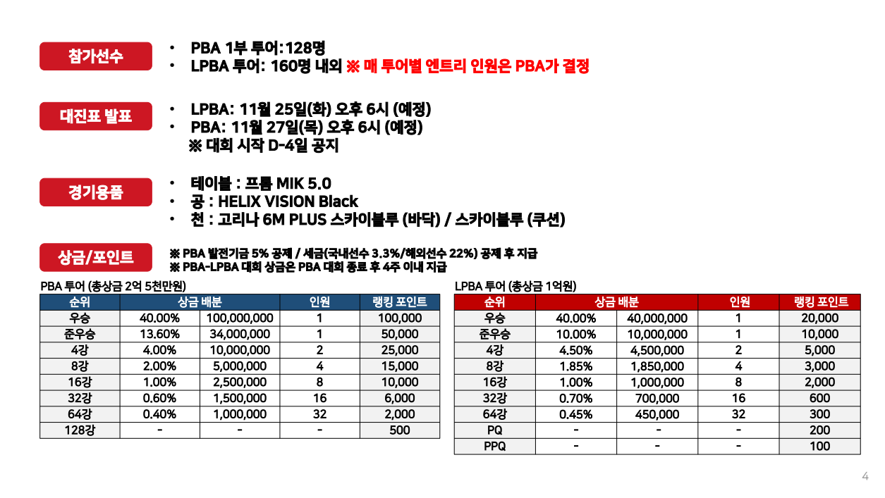 PBA 우승 상금은 1억원으로 전체 상금은 2억5천만원이며, 준우승 3400만원, 4강은 각 1000만원이 지급됩니다. LPBA의 우승 상금은 4천만원이며 총상금은 1억원입니다. 두 투어 모두 포인트가 대거 부여되기 때문에 랭킹 경쟁이 치열해질 것으로 예상됩니다. 모든 상금은 PBA 발전기금 5%와 세금 공제 후 4주 이내에 지급됩니다.