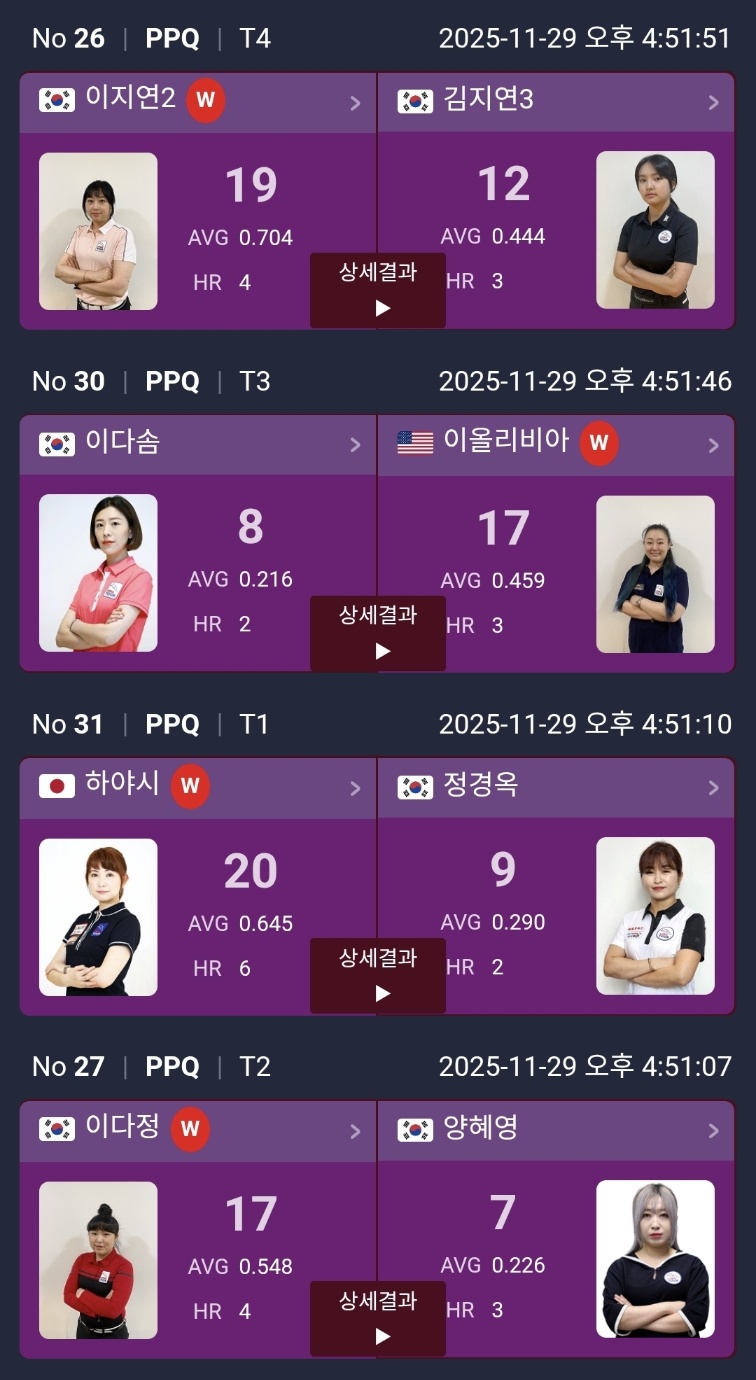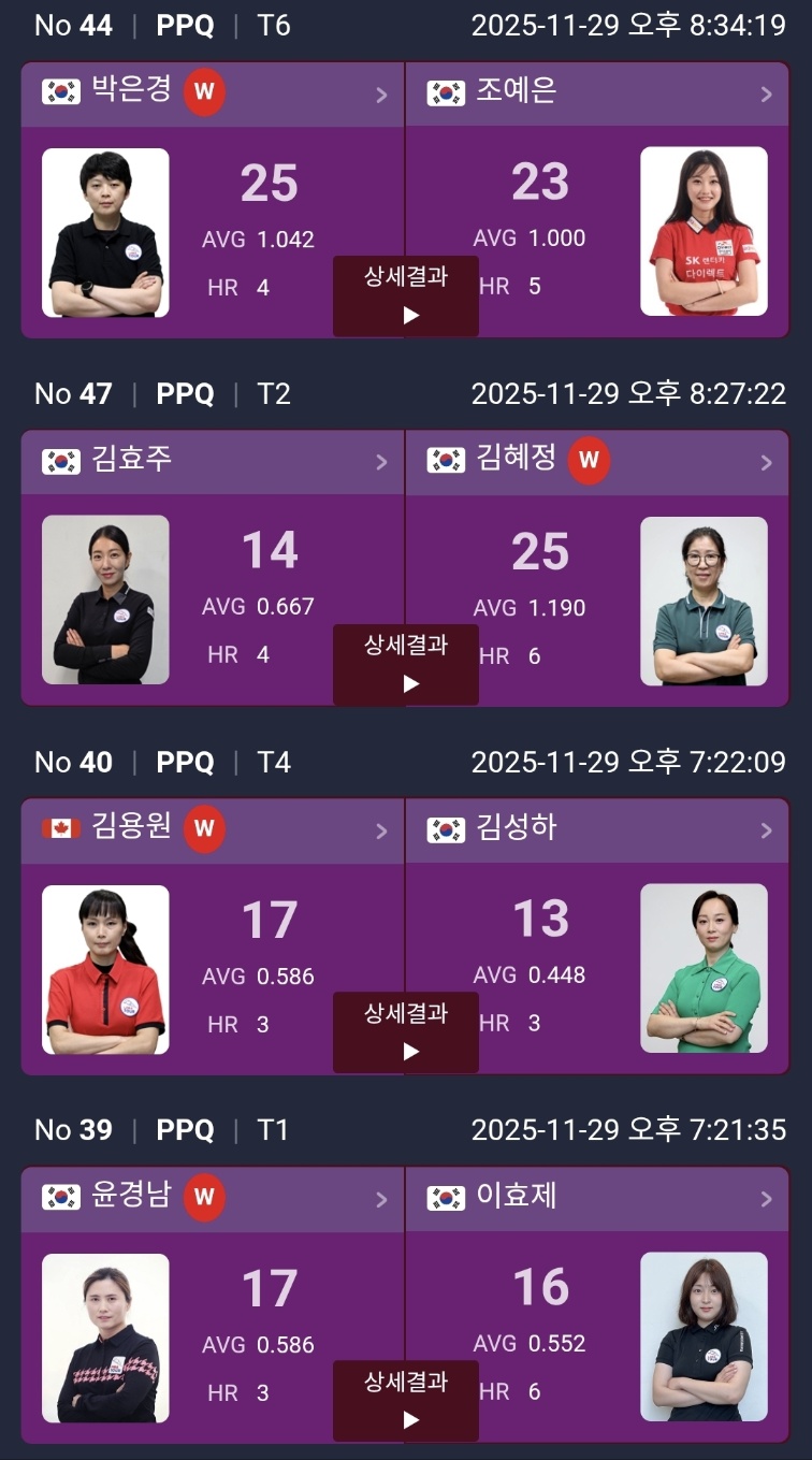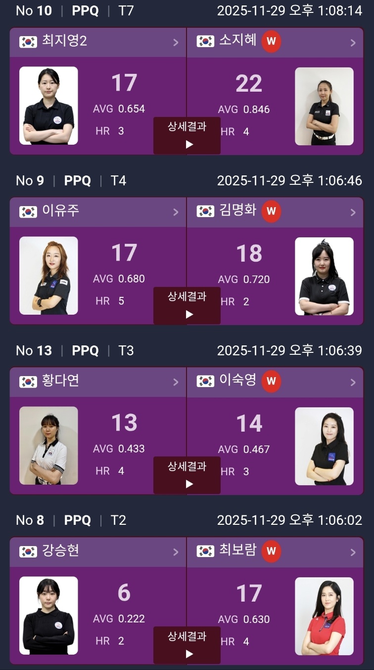 PPQ 라운드 결과에서 확인했듯이, 단판 25점제는 높은 애버리지와 순간적인 하이런을 기록하는 선수가 압도적으로 유리합니다. 특히 김보름(AVG 2.500), 이선경(AVG 1.389), 김도경(AVG 1.250) 선수처럼 1.250 이상의 애버리지를 기록한 선수들은 다음 라운드에서도 강력한 모습을 보여줄 가능성이 높습니다.