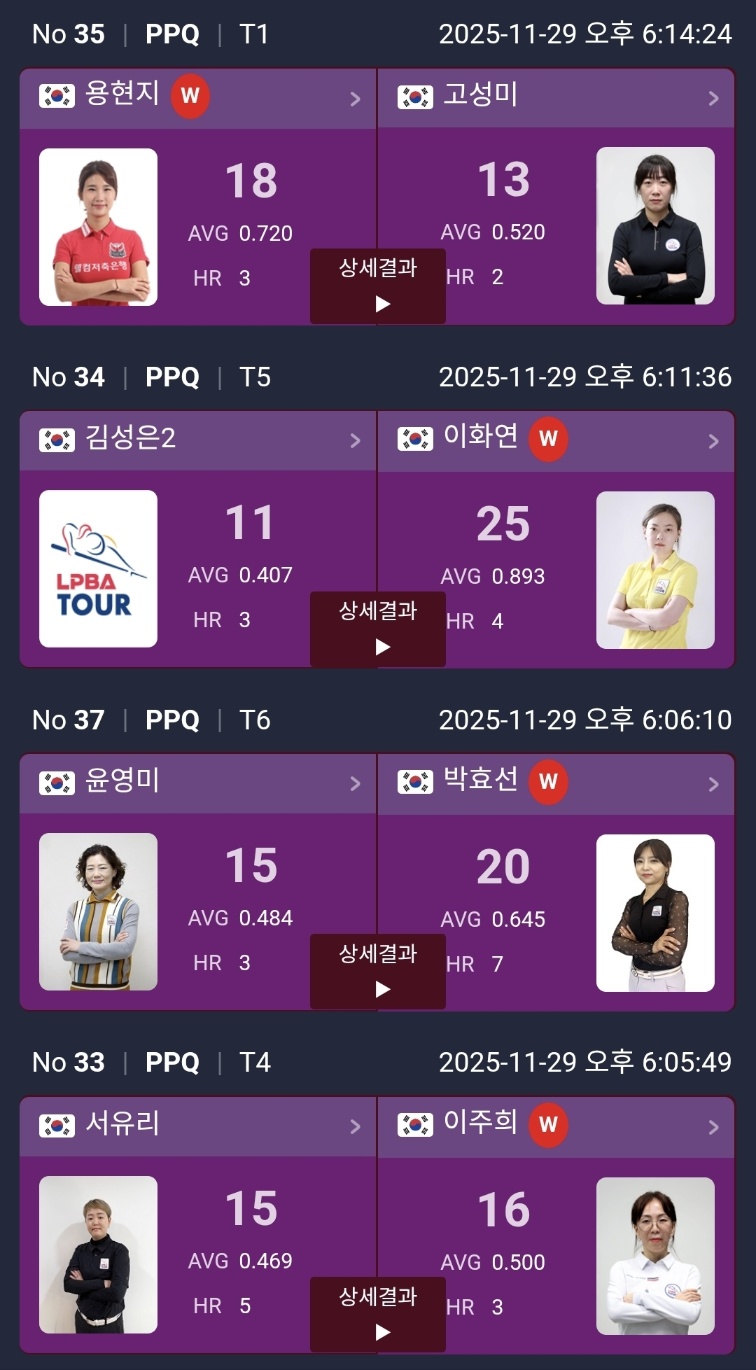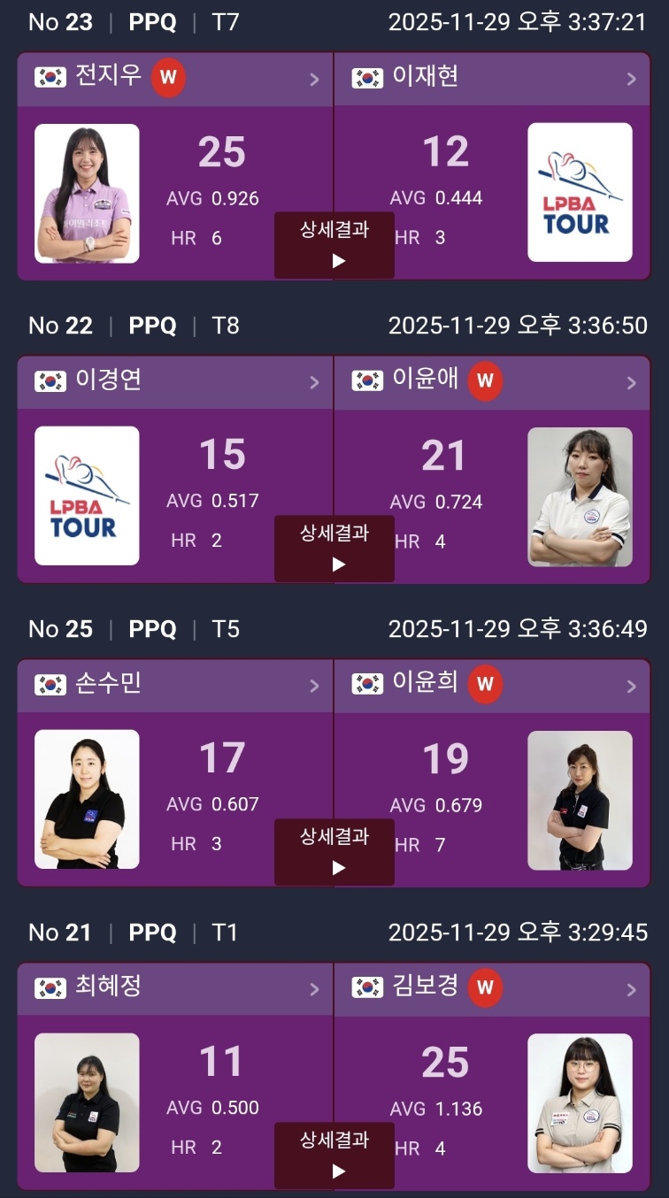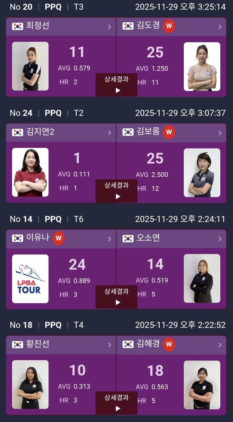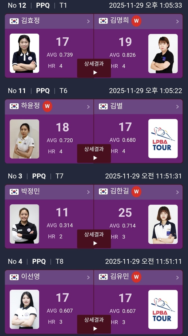 하림 LPBA 챔피언십 2025 PPQ 라운드 경기 결과 및 PQ 대진표