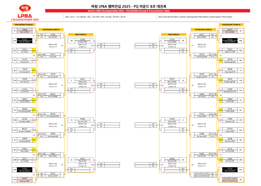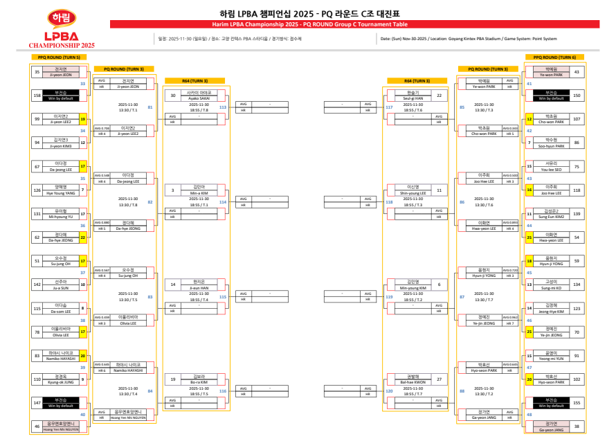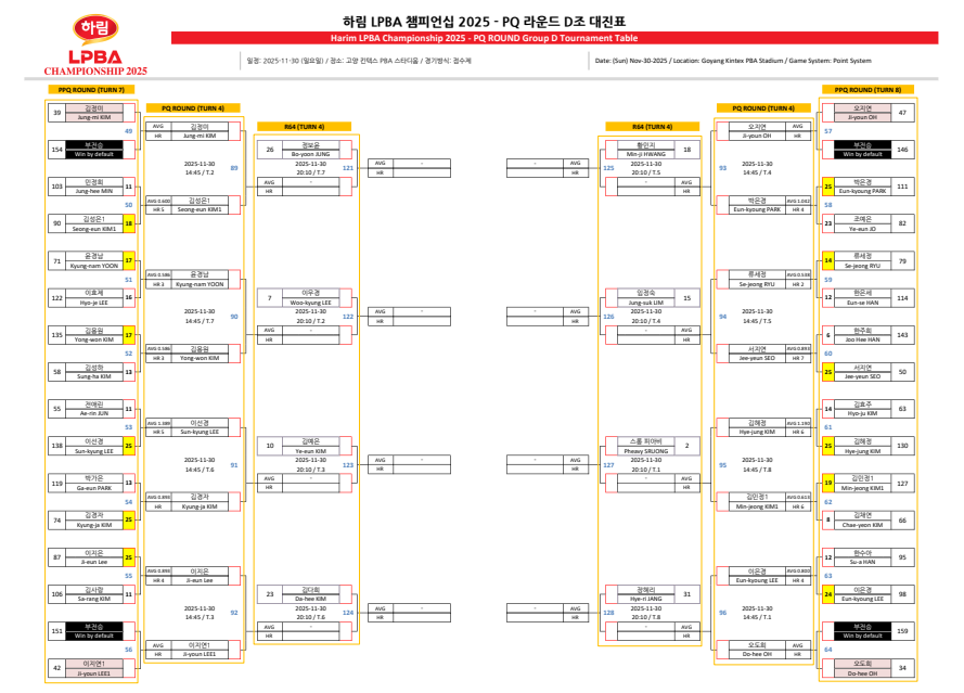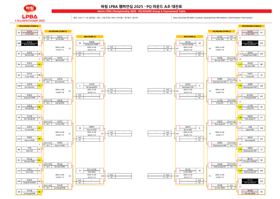 | 하림 LPBA 챔피언십 2025 PQ라운드 경기결과 - 64강 대진표 (0) | 2025.11.30 |