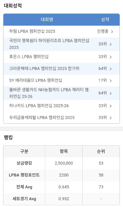 LPBA 상금 랭킹으로 보는 여자 프로당구 선수 순위한국 프로당구는 2019년 6월 출범 이후 남자 PBA와 함께 여자 투어인 LPBA를 운영하며 세계 여자 3쿠션 무대를 빠르게 키워 왔습니다. 현재 진행 중