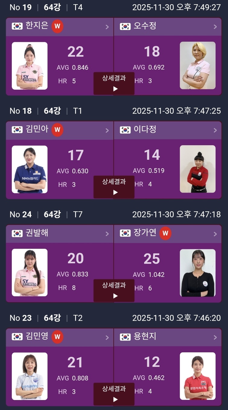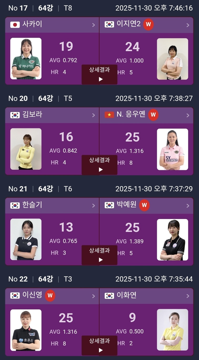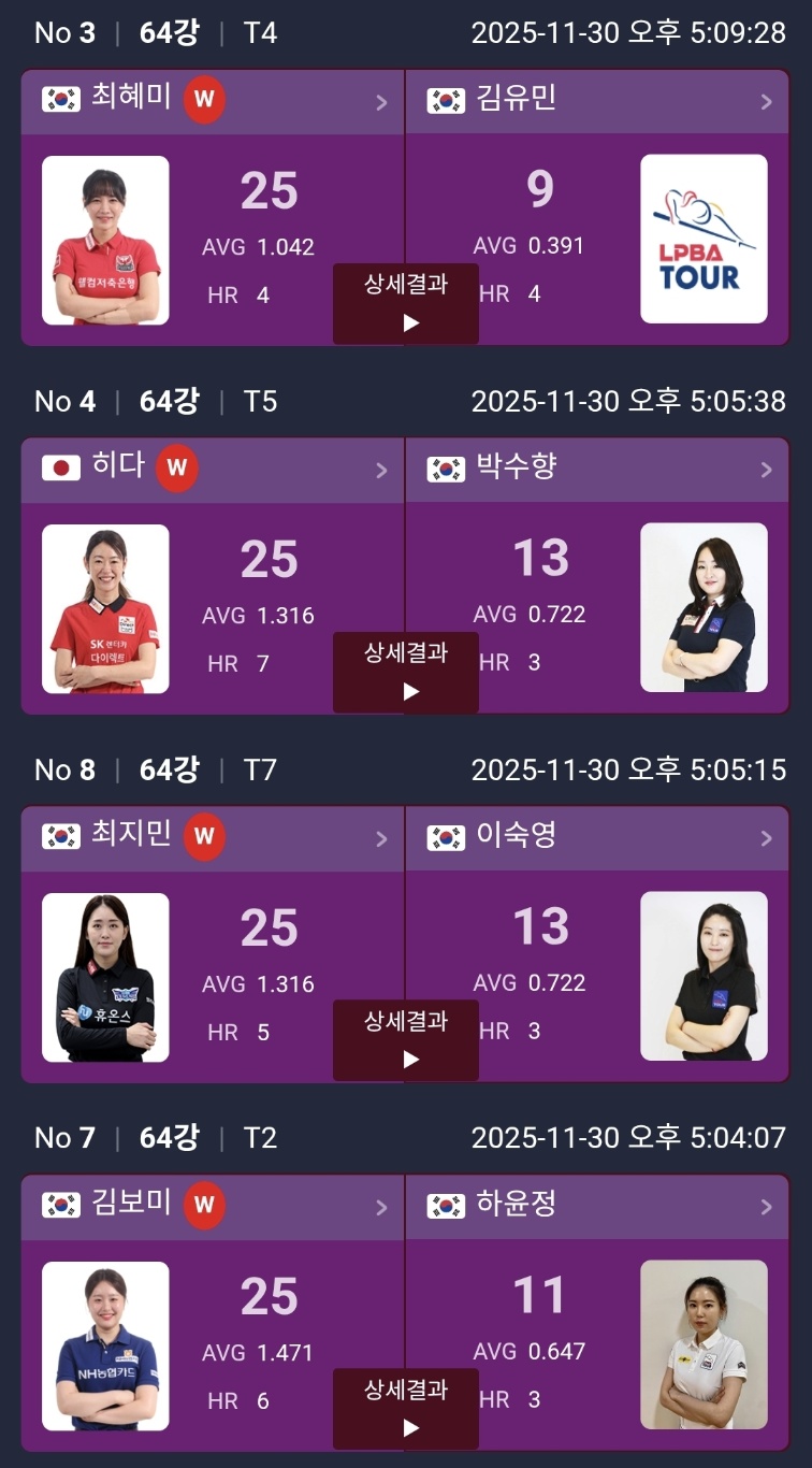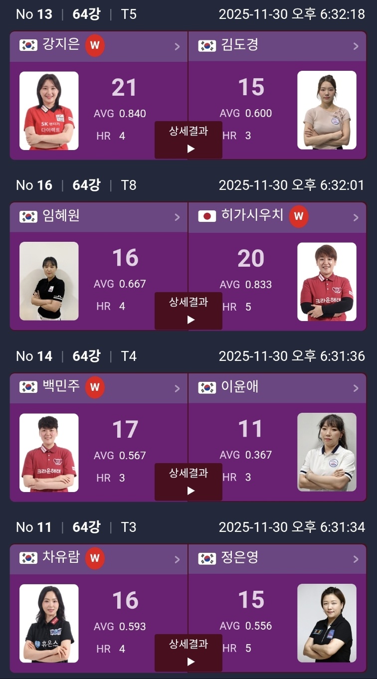 반면 PQ 라운드부터 기세를 이어 온 여러 선수들이 강력한 에버리지와 높은 집중력으로 25점을 완성시키며 32강 진출권을 가져갔습니다. 경기마다 에버리지가 1.0을 넘는 선수들이 다수 등장했으며, 하이런 6~8점을 기록한 공격적인 플레이도 돋보였습니다. 특히 김보미, 김세연, 이신영, 히다, 최지민, 장혜리 선수 등은 1점 이상의 평균 에버리지를 기록하며 압도적인 경기력을 보여주었습니다.