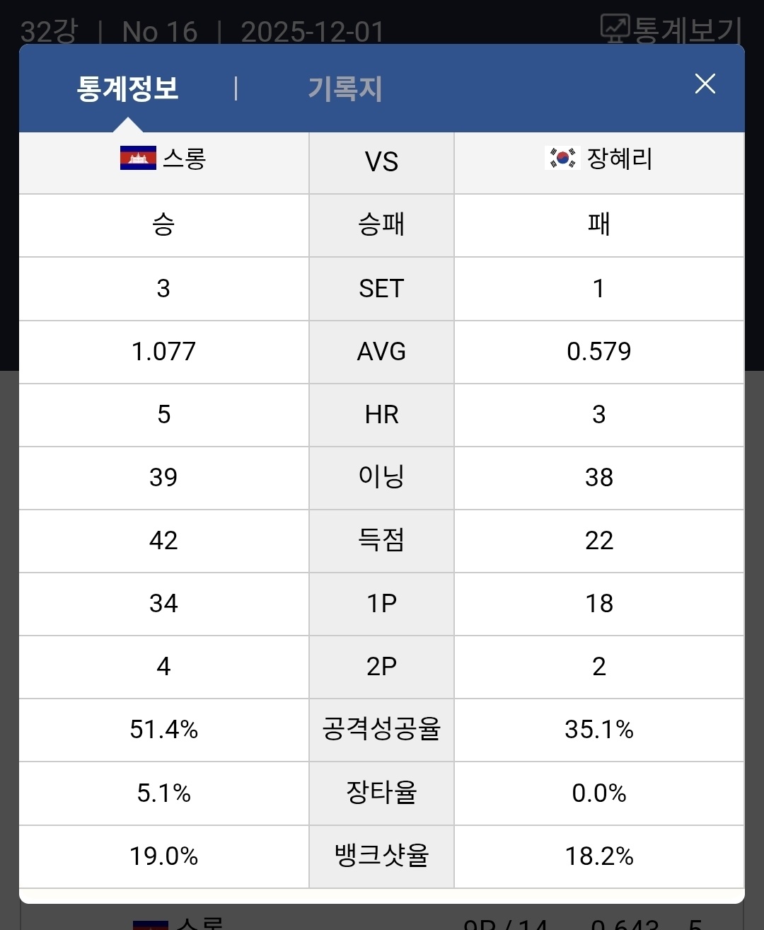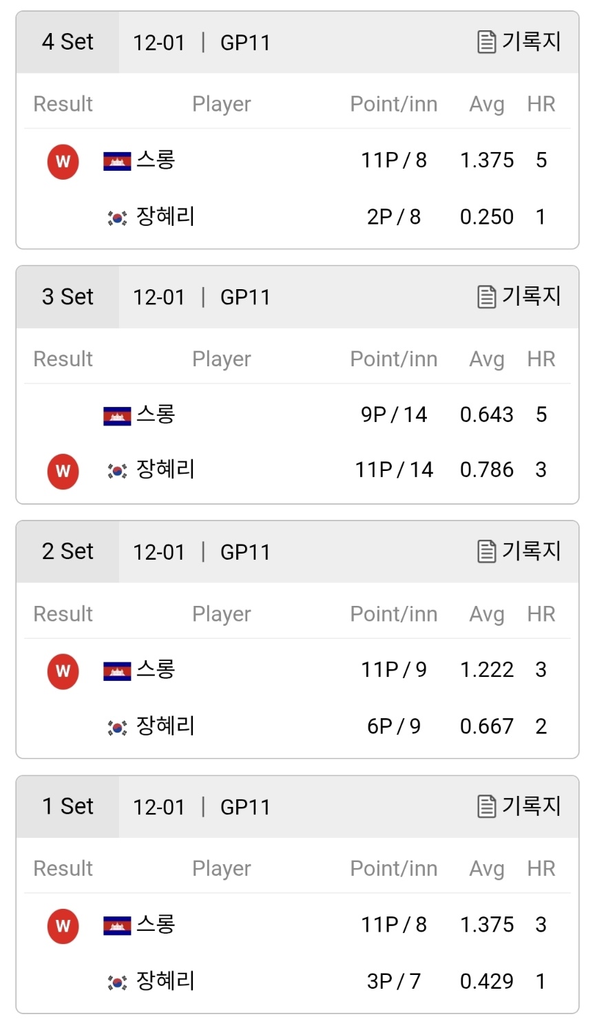 세 번째 세트는 완전히 다른 흐름으로 전개되었습니다. 장혜리 선수는 그동안 스롱 선수에게 자주 승리를 거두었던 경험답게 공격 템포를 조절하며 안정적인 득점을 쌓았습니다. 11득점을 기록하며 에버리지 0.786으로 세트를 가져갔고, 특히 하이런 3점 장면은 경기 분위기를 완전히 반전시키는 포인트였습니다. 스롱 역시 하이런 5점을 기록하며 맞섰지만, 장혜리의 수비와 득점 흐름이 우세한 세트였습니다.