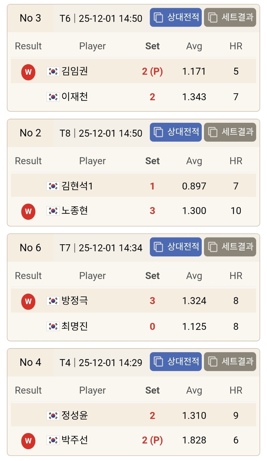 김임권과 이재천의 경기는 2대2 동점 끝에 승부치기로 결정되었고, 김임권이 평균 1.171과 하이런 5점을 기록하며 최종 승자가 되었습니다. 정성윤과 박주선의 경기도 승부치기 끝에 박주선이 승리를 거두었고, 평균 1.828이라는 높은 수치를 기록하며 안정적인 득점을 만들어냈습니다. 신기웅은 김민건을 3대0으로 잡아내며 깔끔한 승리를 거두었고, 평균 1.125를 기록하며 후반 집중력에서도 강한 모습을 보였습니다.