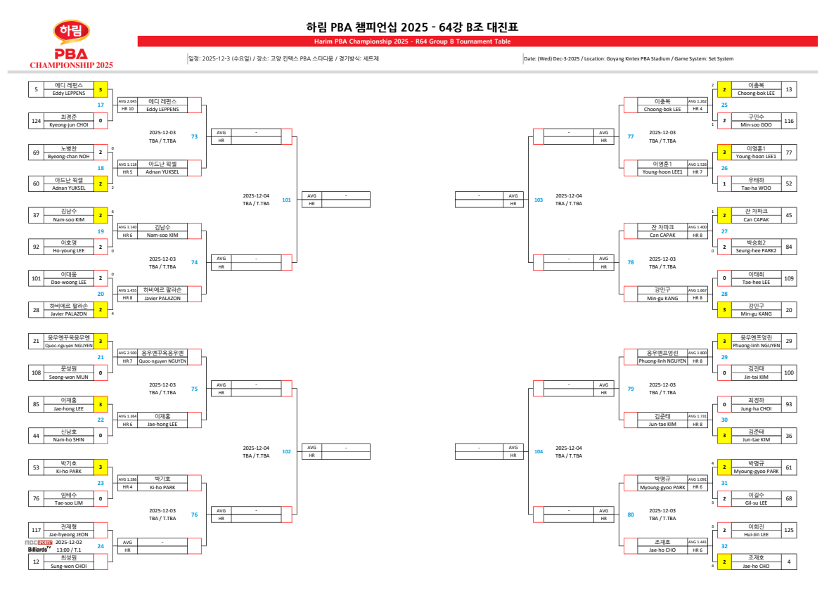 | 하림 LPBA 챔피언십 2025 32강 1일차 경기결과 - 16강 대진표 1차 완성 (0) | 2025.12.02 |