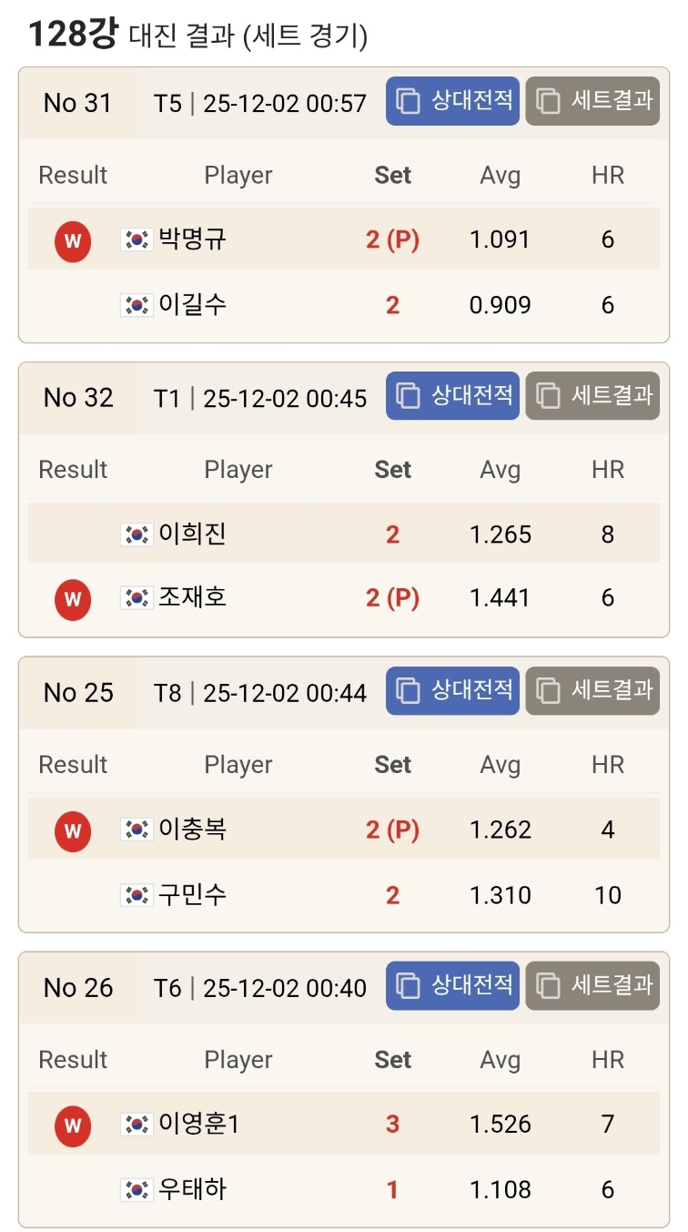전체적으로 이번 128강 1일차는 예상 밖의 고득점 경기가 다수 등장하며 대회 전반의 흐름을 더욱 흥미롭게 만들었고, 앞으로 이어질 라운드는 누가 상승세를 이어갈지 예측하기 어려울 만큼 각 선수들의 경기력 편차가 적다는 점이 특징입니다.