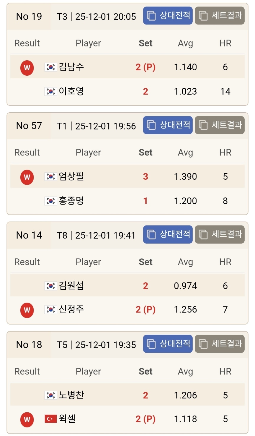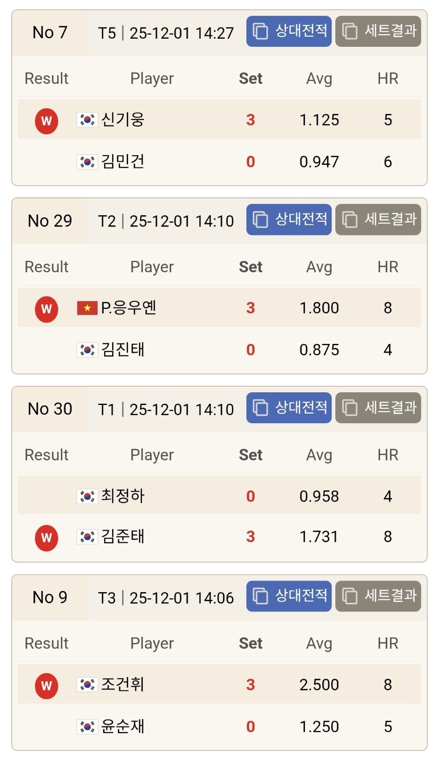 이재홍은 신남호를 상대로 3대0 승리를 거두며 평균 1.364를 기록했고, 박기호도 임태수를 3대0으로 제압하며 무난하게 다음 라운드에 진출했습니다. 베트남의 P.응우옌은 김진태를 상대로 평균 1.800을 기록하며 3대0으로 승리했고, Q.응우옌 역시 문성원을 상대로 3대0을 기록하며 강력한 득점 감각을 보여주었습니다.