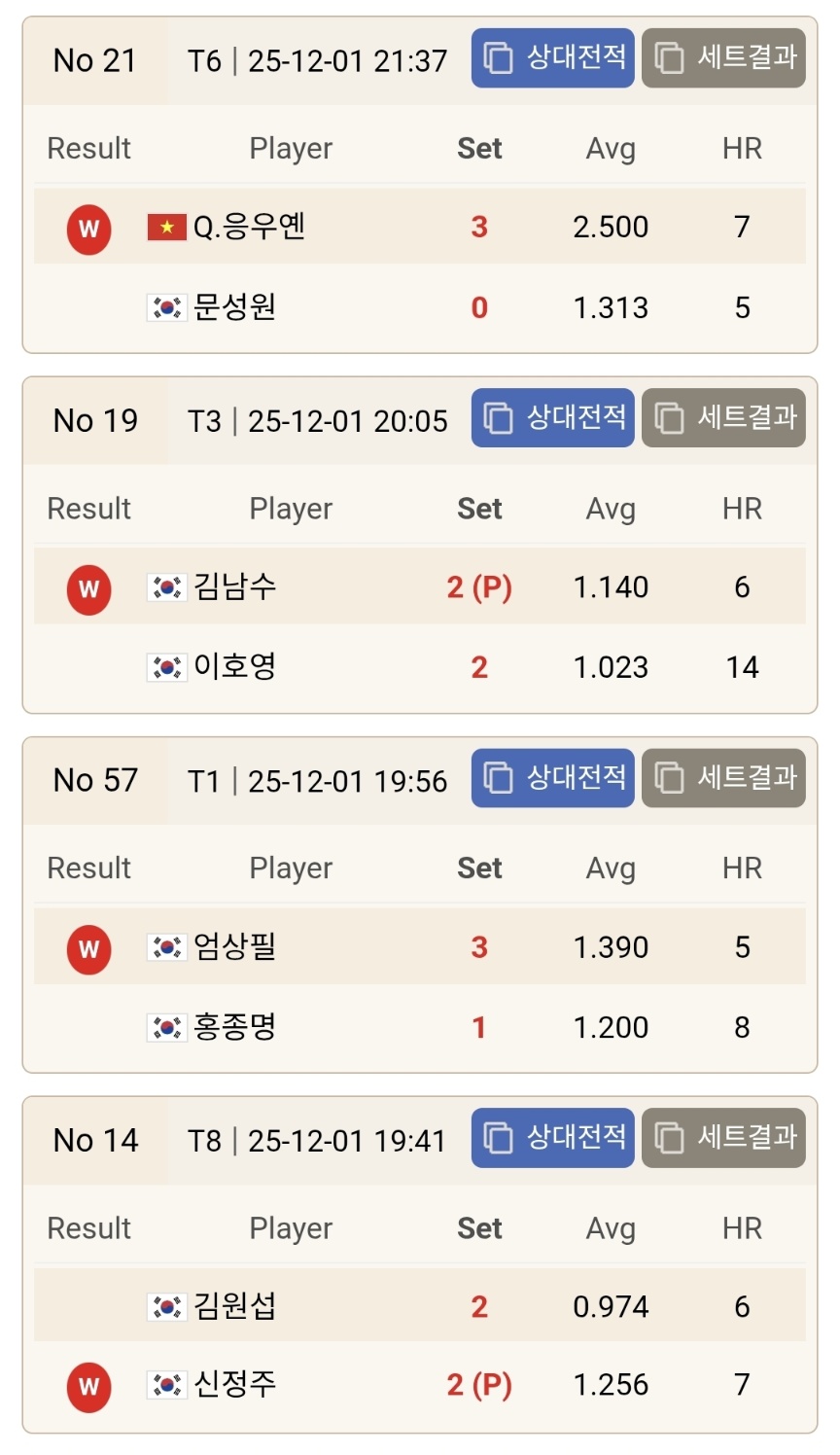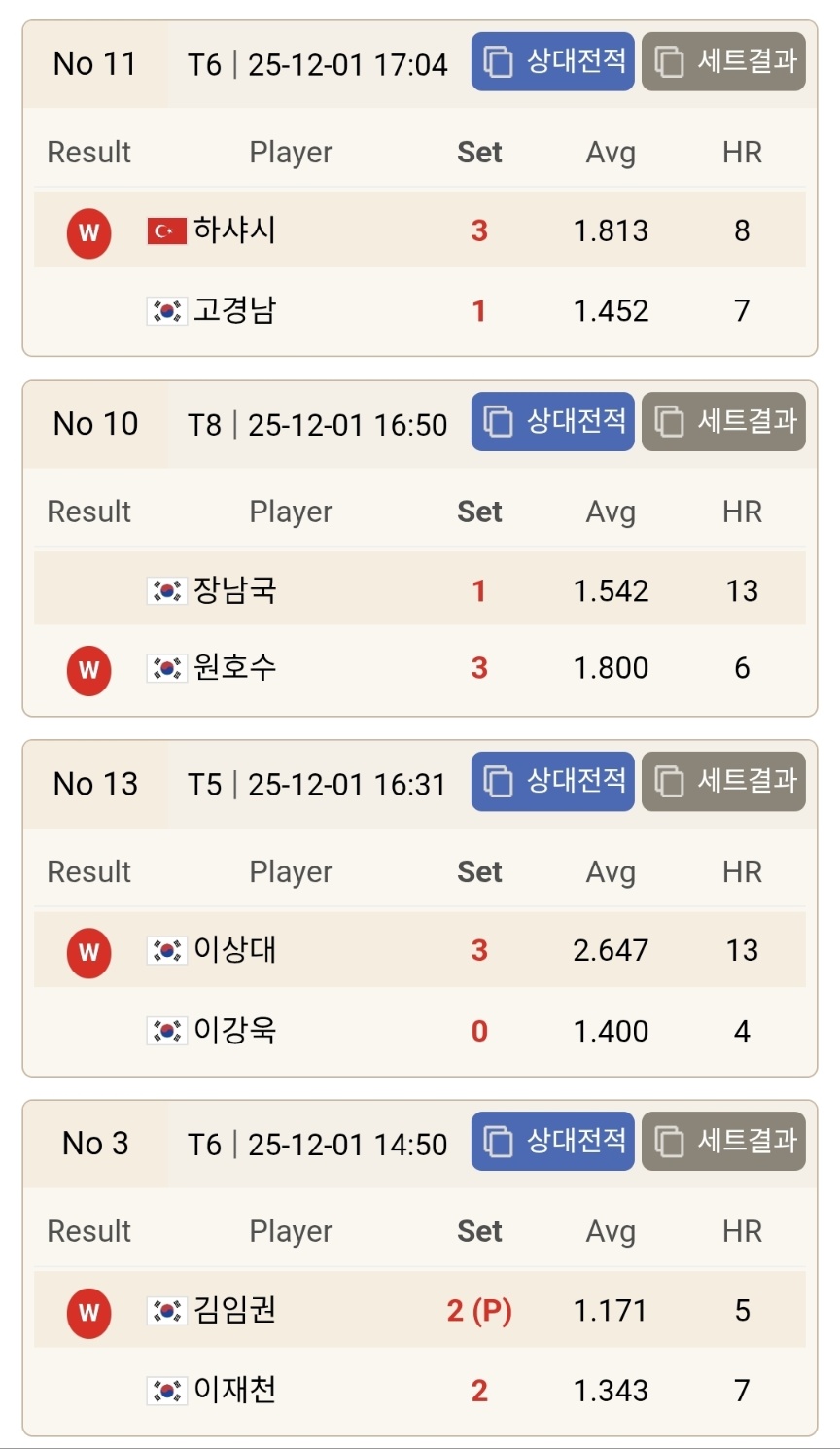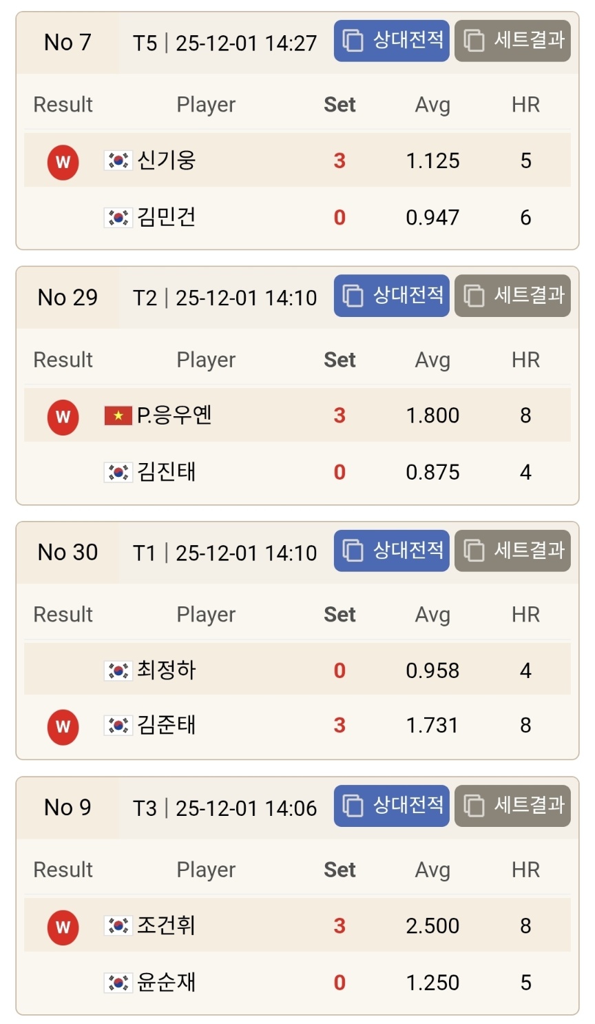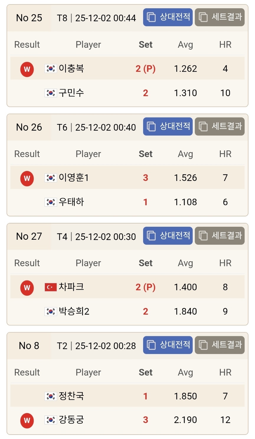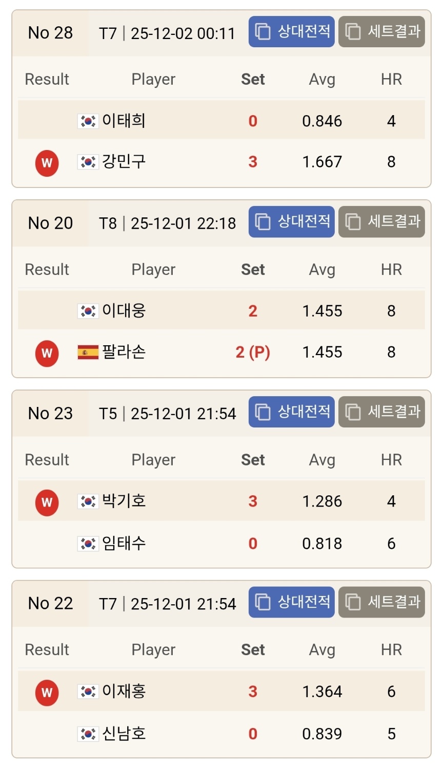 먼저 눈에 띄는 결과는 김영원, 김병호, 사파타, 초클루 등 이전 시즌 우승 경험이 있는 강자들이 줄줄이 128강에서 탈락했다는 점입니다. 김병호는 김홍민과의 접전 끝에 승부치기로 패하며 AVG 1.708이라는 높은 기록에도 불구하고 승기를 잡지 못했습니다. 김홍민은 경기 내내 집중력을 잃지 않았고 하이런 6점을 기록하며 세트 후반의 승부처를 과감하게 공략해 승리했습니다. 이 결과는 이번 라운드에서 가장 상징적인 이변으로 평가됩니다.
