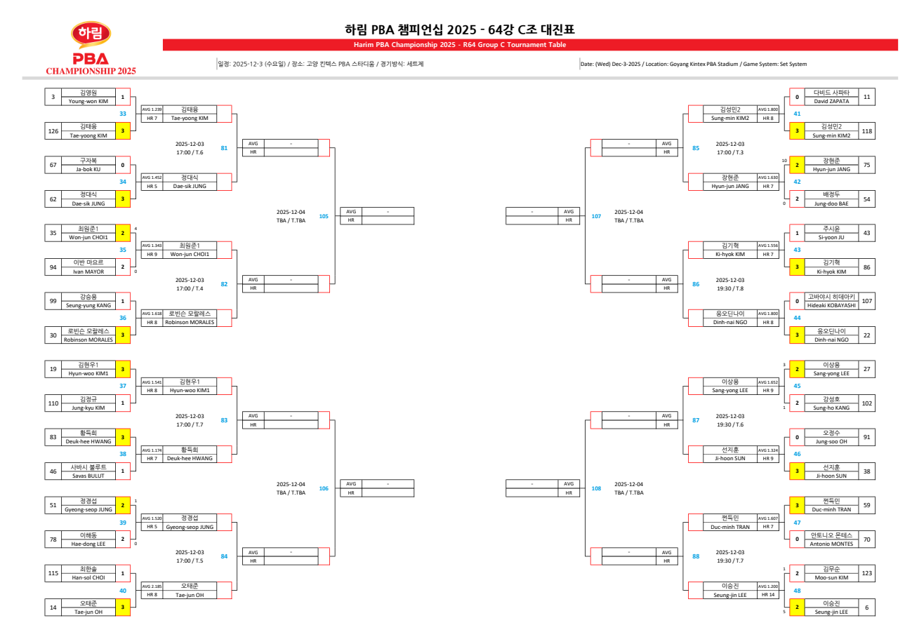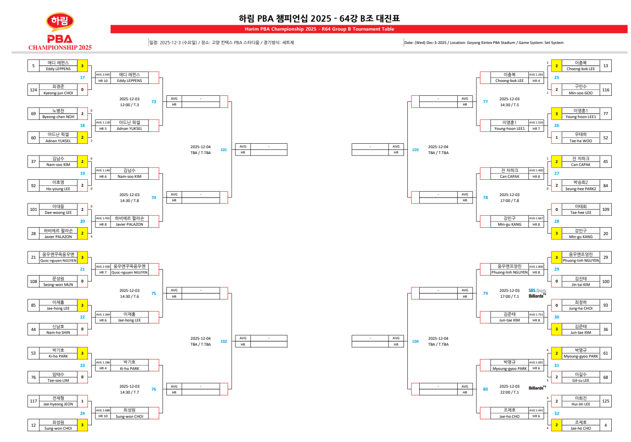 | 하림 LPBA 챔피언십 2025 32강 경기 결과 - 16강 대진표 (최종) (0) | 2025.12.03 |