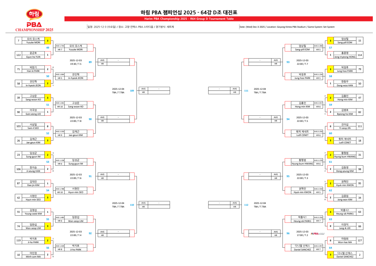 | 하림 PBA 챔피언십 2025 128강 1일차 경기결과 - 유망선수 TOP7 - 64강 대진표 (0) | 2025.12.02 |