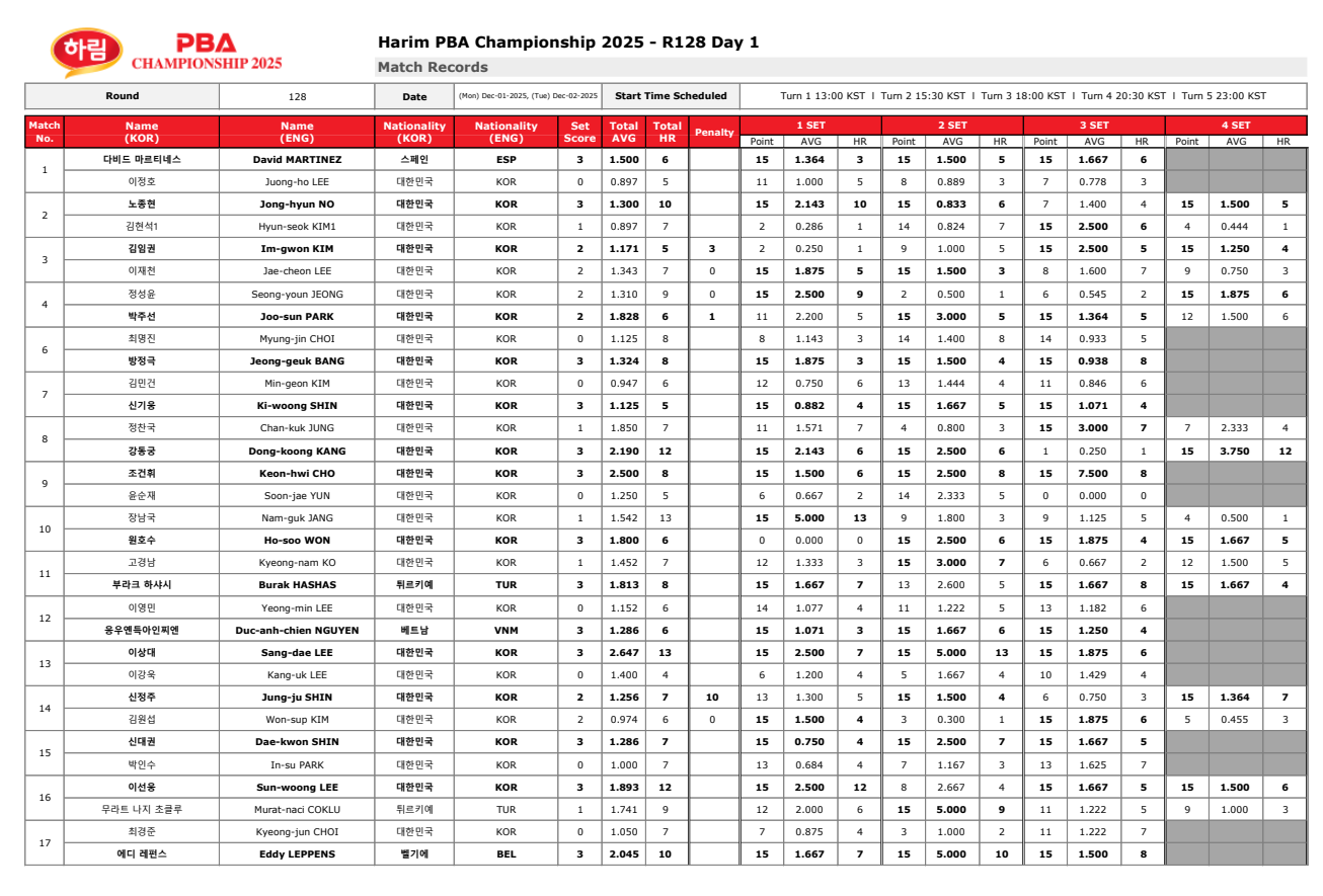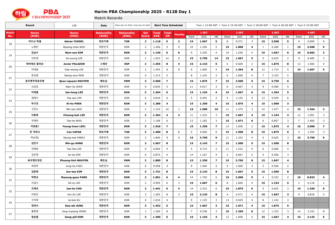 하림 PBA 챔피언십 2025 128강 최종 경기결과