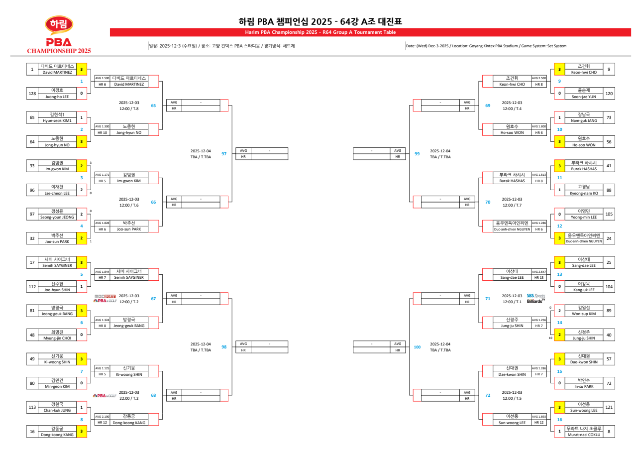 하림 PBA 챔피언십 2025 128강 최종 경기결과 및 64강 대진표