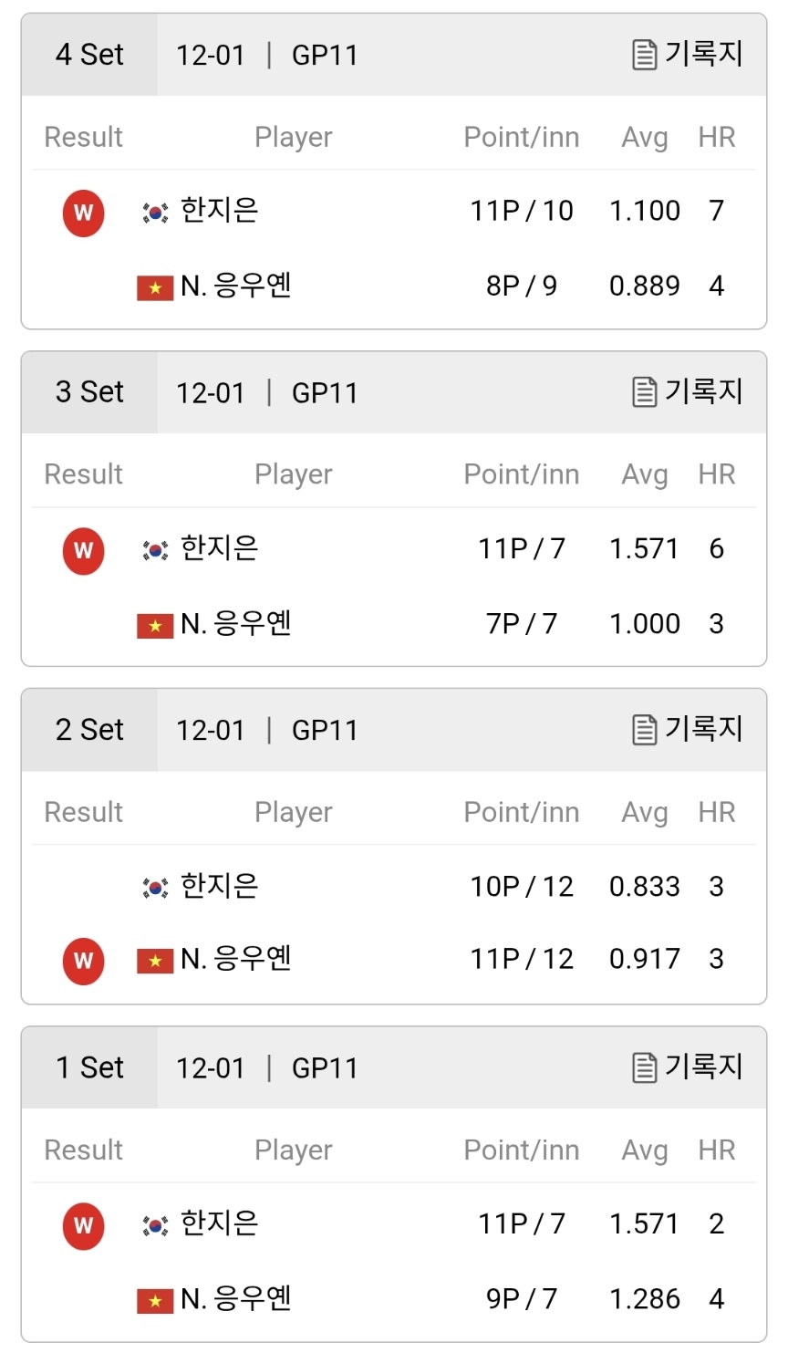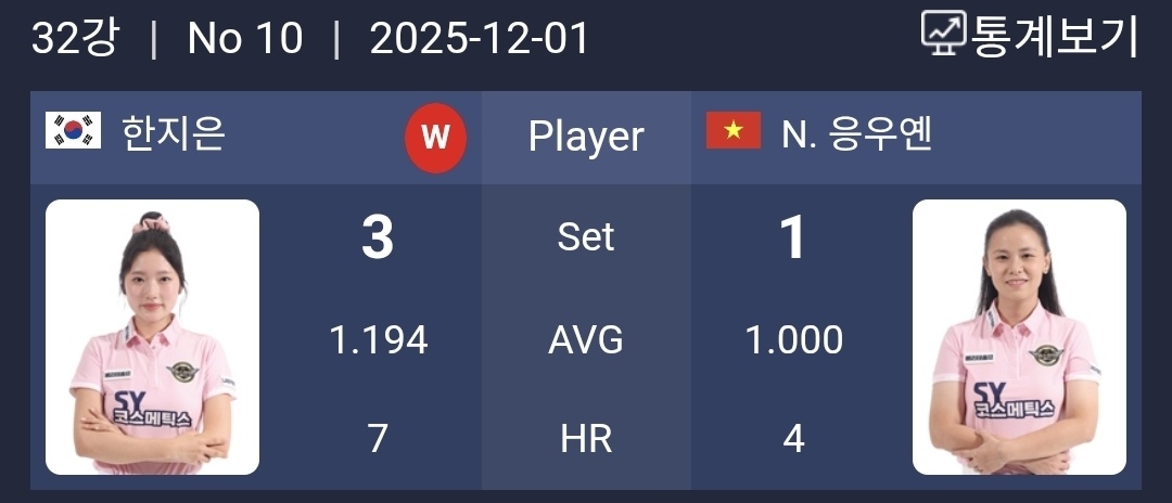 하지만 3세트부터 한지은의 리듬이 완전히 살아났습니다. 7이닝 만에 11점을 다시 기록하며 AVG 1.571이라는 높은 수치를 만들어냈습니다. 경기 내내 가장 인상적이었던 장면은 6점 하이런이 터진 순간으로, 포지션 유지와 키스 관리가 완벽하게 맞아떨어졌습니다. 응우옌호앙옌니도 흔들리지 않고 7득점을 했지만 한지은의 폭발적인 득점 흐름을 막기에는 역부족이었습니다.