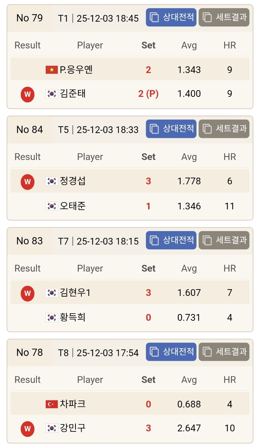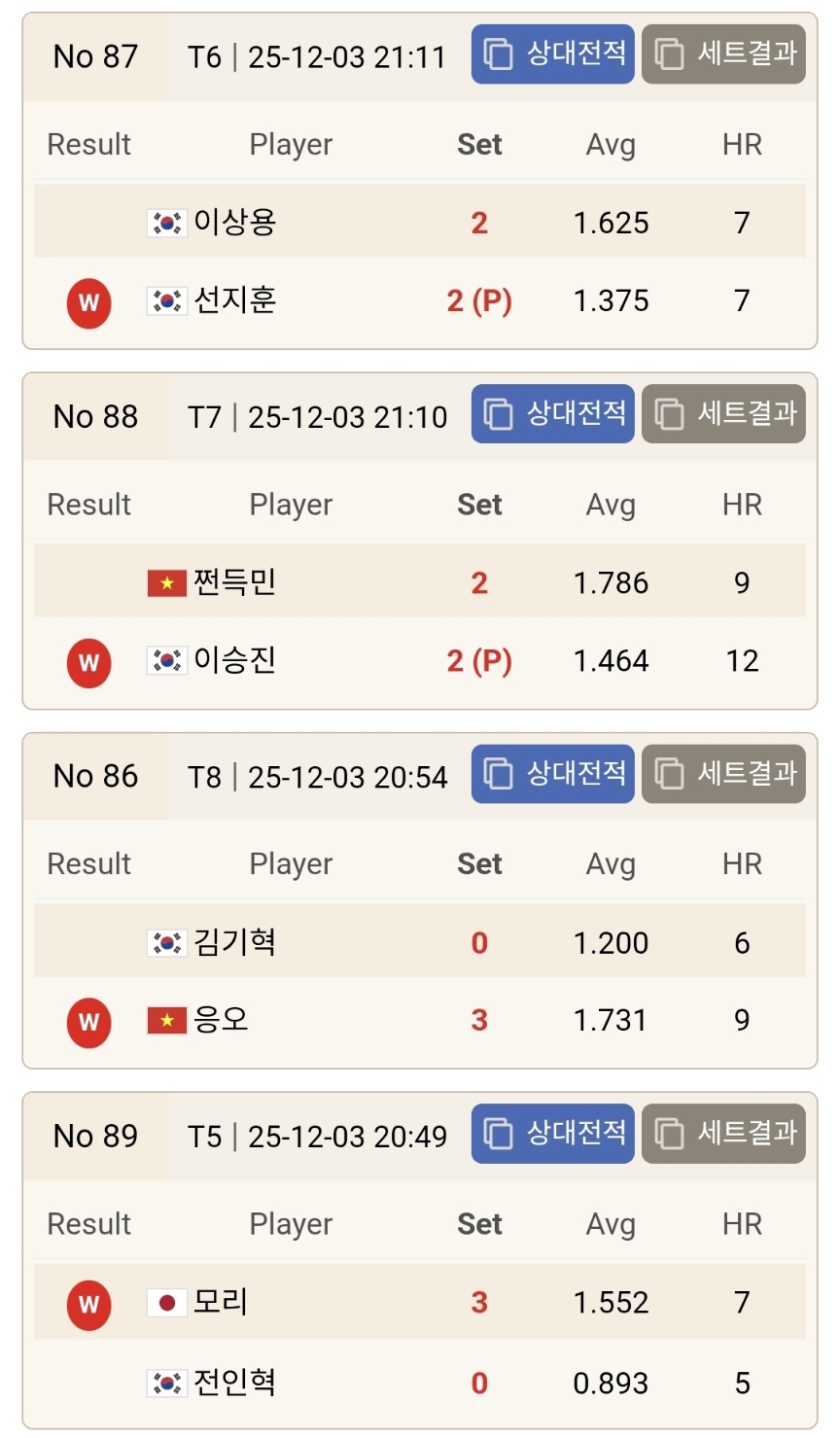 김태융 역시 64강에서 가장 인상적인 경기력을 보여준 선수 중 한 명이었습니다. 김태융은 정대식을 상대로 초반부터 안정적인 리듬을 유지하며 주도권을 잡았습니다. 정대식이 흐름을 바꾸기 위해 후반부에 공격적인 운영을 가져갔지만, 김태융은 흔들림 없는 득점 템포로 승부치기까지 끌고 가 결국 3세트를 확보하며 승리를 결정지었습니다. 특히 세트 단위 경기에서 보여준 평균득점과 HR 기록은 김태융이 이번 시즌 단순한 복병이 아닌 명확한 ‘경쟁자’임을 다시 한 번 증명하는 장면이었습니다.