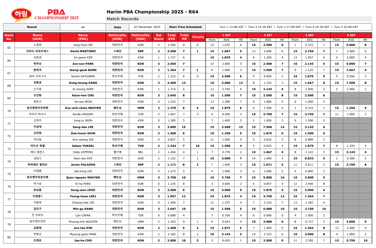 특히 마르티네스는 64강에서 2.500의 높은 평균득점을 기록하며 상대를 압도하는 경기 내용을 보여주었고, 산체스 역시 흔들림 없이 세트를 쓸어오며 64강 최상위급 경기력을 증명했습니다. 이번 대회는 외국 선수들의 에버리지 수준이 전반적으로 높아진 것이 특징인데, 이는 PBA의 글로벌 경쟁력이 다시 한 번 치열해지고 있음을 보여주는 진단으로 볼 수 있습니다.