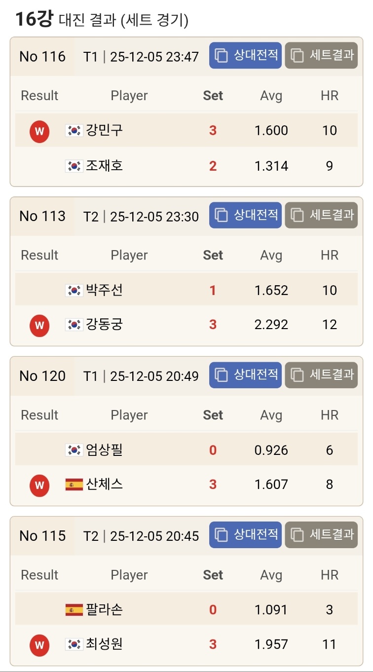 또 다른 빅매치였던 박주선과 강동궁의 경기는 강동궁의 완승으로 마무리되었습니다. 세트 평균 2.292, 하이런 12점을 기록한 강동궁은 경기 내내 뛰어난 테이블 감각을 보여주며 무서운 득점 폭발력을 증명했습니다. 박주선은 애버리지 1.652로 나쁘지 않은 경기 내용을 만들었지만, 강동궁의 득점 리듬을 끊기에는 역부족이었습니다.