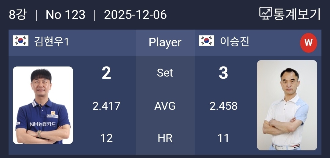 이승진은 2세트와 4세트를 가져오며 승부를 원점으로 돌렸고, 결국 마지막 5세트에서 ‘대역전승’이라는 말이 어울리는 기적을 만들어냈습니다. 패색이 짙어 보이던 상황에서 단 2이닝 만에 11점을 몰아치는 퍼펙트큐를 만들어 내며 경기를 단숨에 뒤집었습니다. 해당 세트 평균은 무려 5.500에 달했고, 경기 전체 평균 역시 2.458로 김현우보다 근소하게 높은 수치를 기록했습니다.