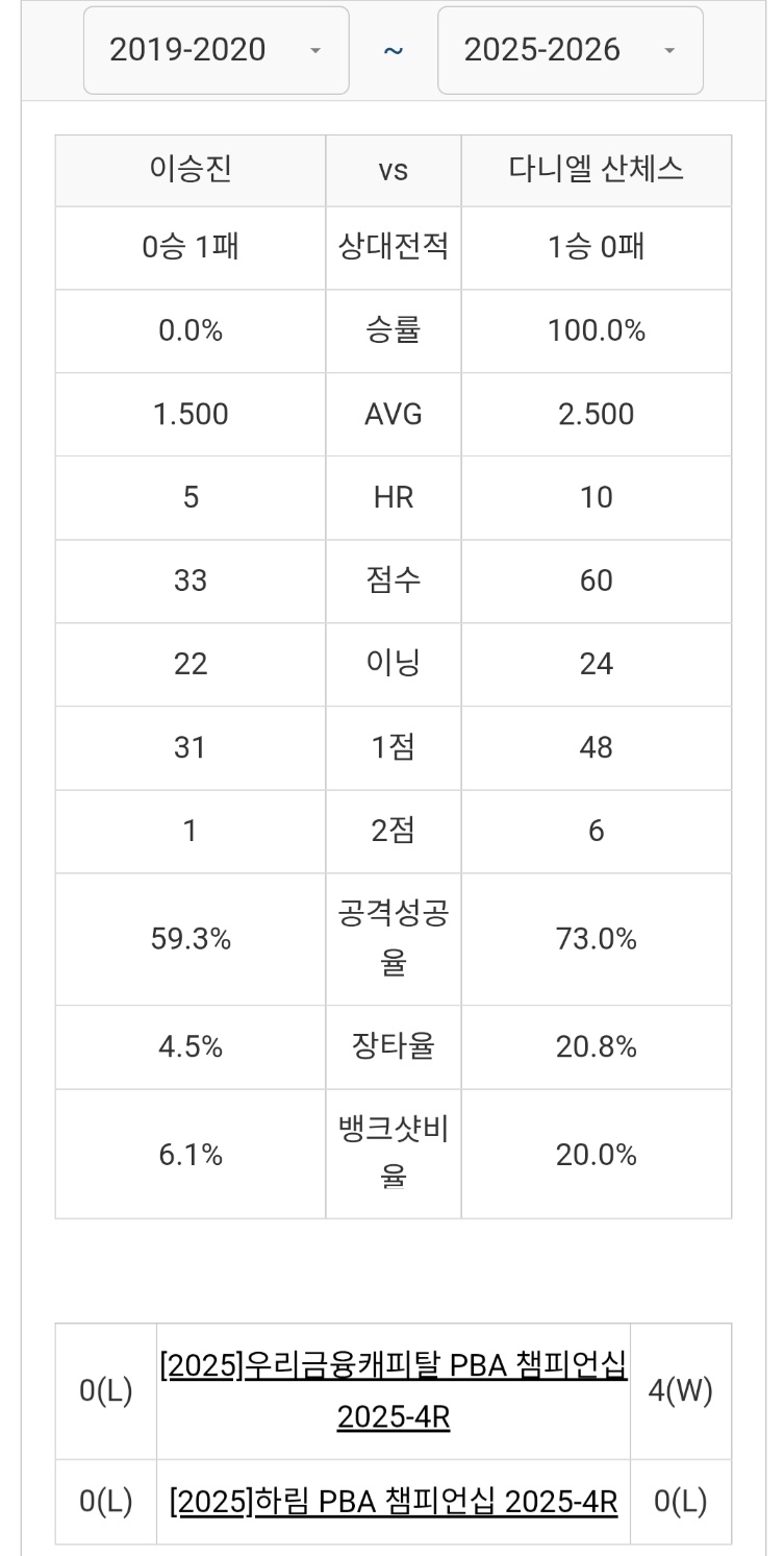 이승진 VS 다니엘 산체스 PBA 경기 전적 비교 (2025년 12월 6일 기준)
