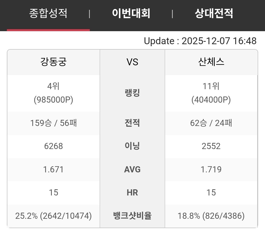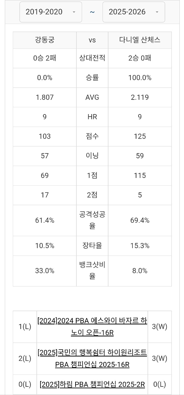 강동궁 VS 다니엘 산체스 PBA 경기 전적 비교 (2025. 12. 6 기준)