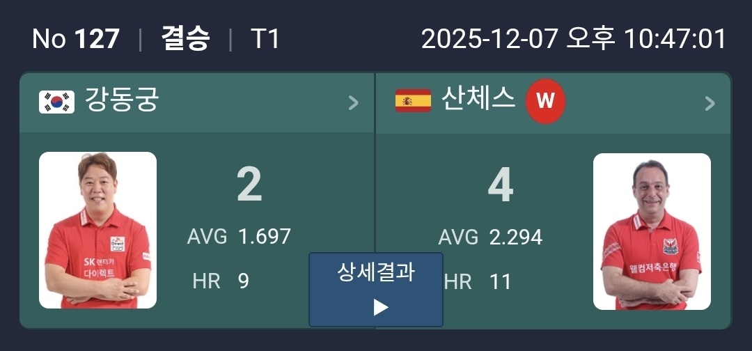 | 하림 PBA 챔피언십 2025 4강 경기결과 결승 대진표 - 강동궁 산체스 세번째 맞대결 (0) | 2025.12.07 |