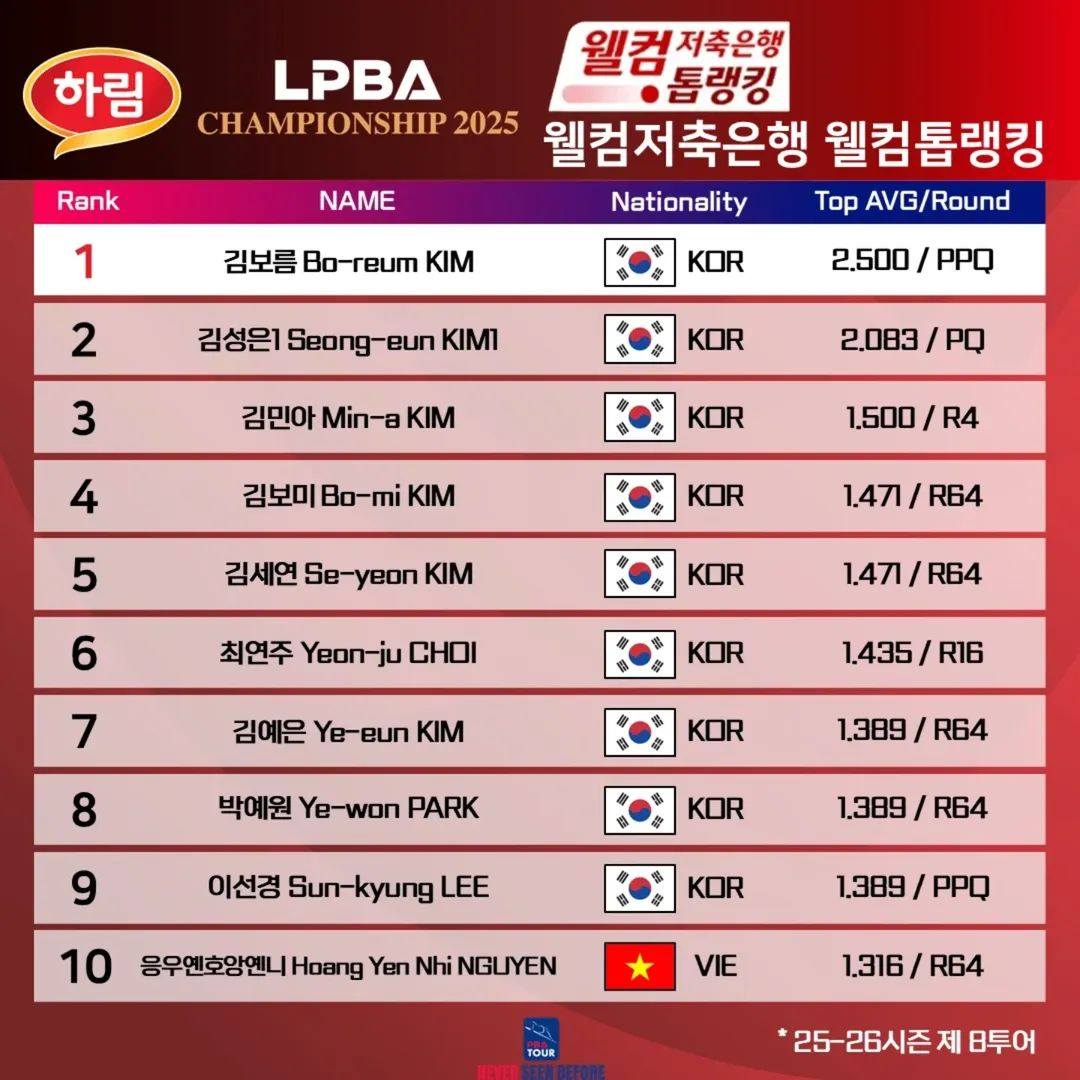 웰컴저축은행 웰컴 톱랭킹은 앞으로도 LPBA 경기에서 가장 중요한 관전 포인트 중 하나가 될 것이며, 팬들에게는 “이번 대회의 최강 애버리지”를 확인하는 재미를 더해 줄 전망입니다.