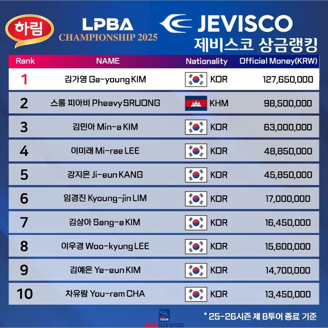 오늘은 하림 LPBA 챔피언십 2025가 종료된 현재 시점, 2025-2026 시즌 8차 투어 기준으로 발표된 LPBA 상금 랭킹 TOP10을 정리해 드립니다. 김가영과 스롱 피아비가 치열하게 선두 경쟁을 이어가는 가운데, 시즌 잔여 대회에서 순위 변동 가능성이 매우 높아 관심이 집중되고 있습니다.