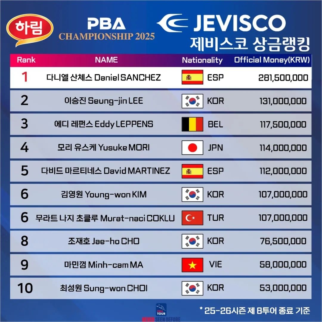오늘은 하림 PBA 챔피언십 2025가 종료된 현재 시점, 2025-2026 시즌 8차 투어 기준으로 발표된 PBA 상금 랭킹 TOP10을 정리해드립니다. 다니엘 산체스가 이번 시즌 기세를 완전히 장악한 가운데, 남은 두 대회에서 순위 판도가 어떻게 움직일지 팬들의 관심이 집중되고 있습니다.