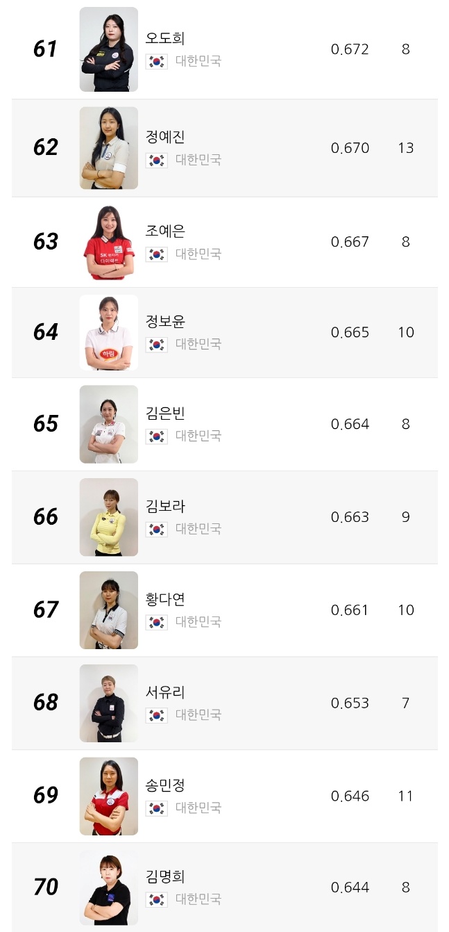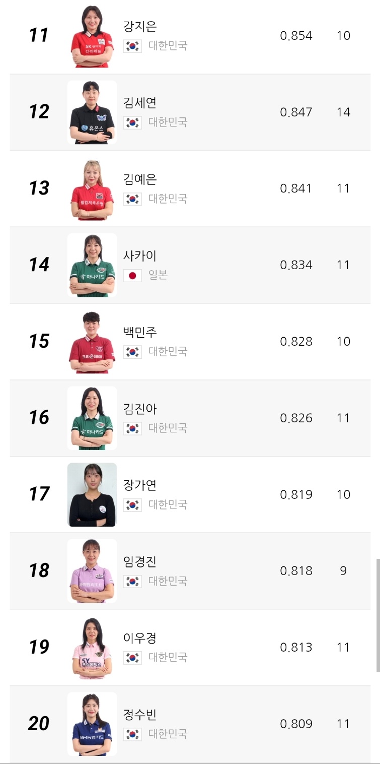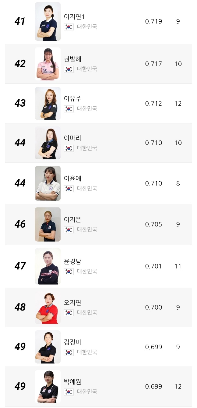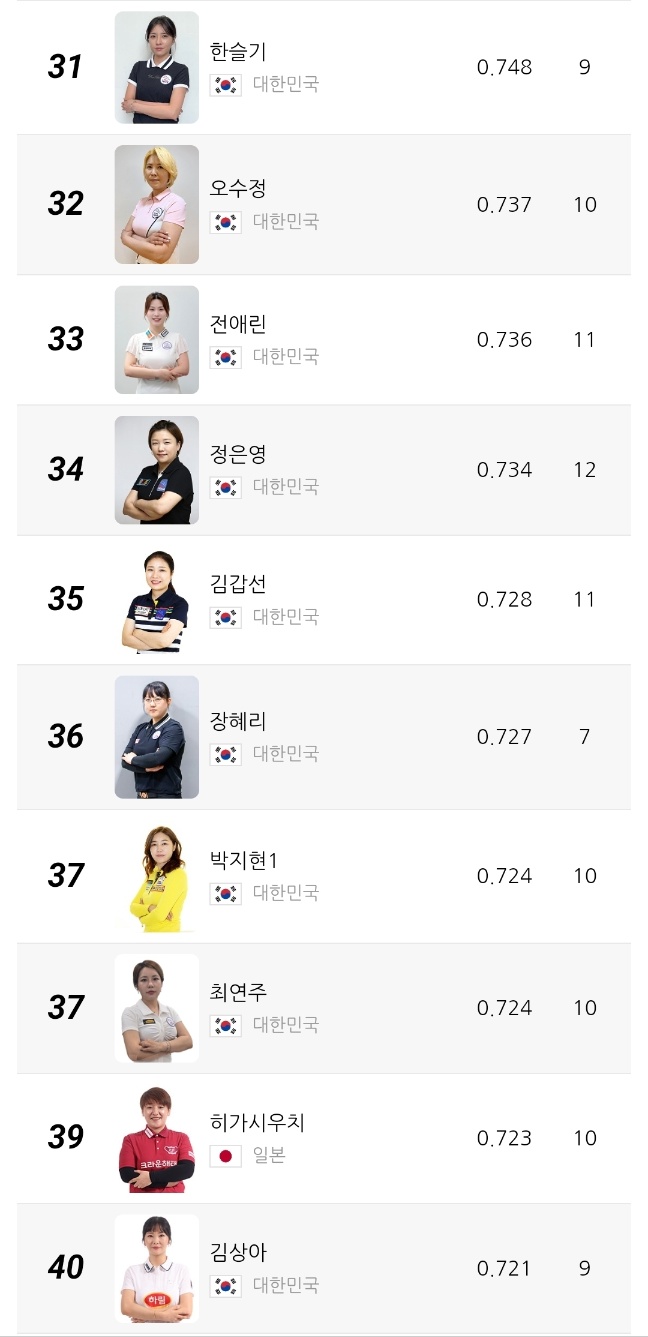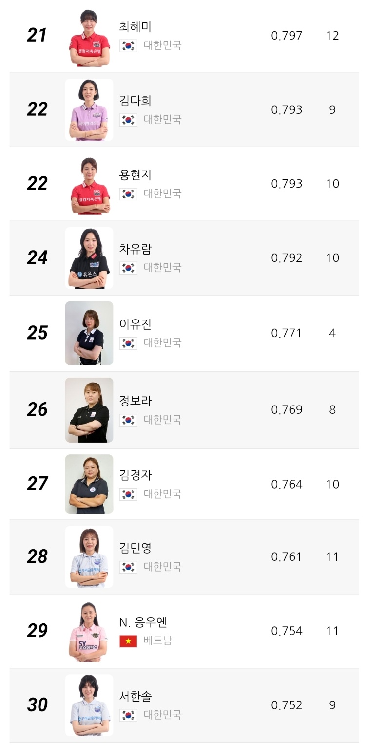 2위는 캄보디아 출신 스롱 피아비 선수로 애버리지 0.980을 기록 중입니다. 한때 UMB 무대를 평정했던 경험이 그대로 반영되듯, 여전히 높은 득점 효율과 안정적인 흐름을 유지하고 있습니다. 3위 한지은 선수는 0.972의 애버리지를 기록하며 한국 선수 중 김가영 다음으로 높은 수치를 보이고 있습니다.