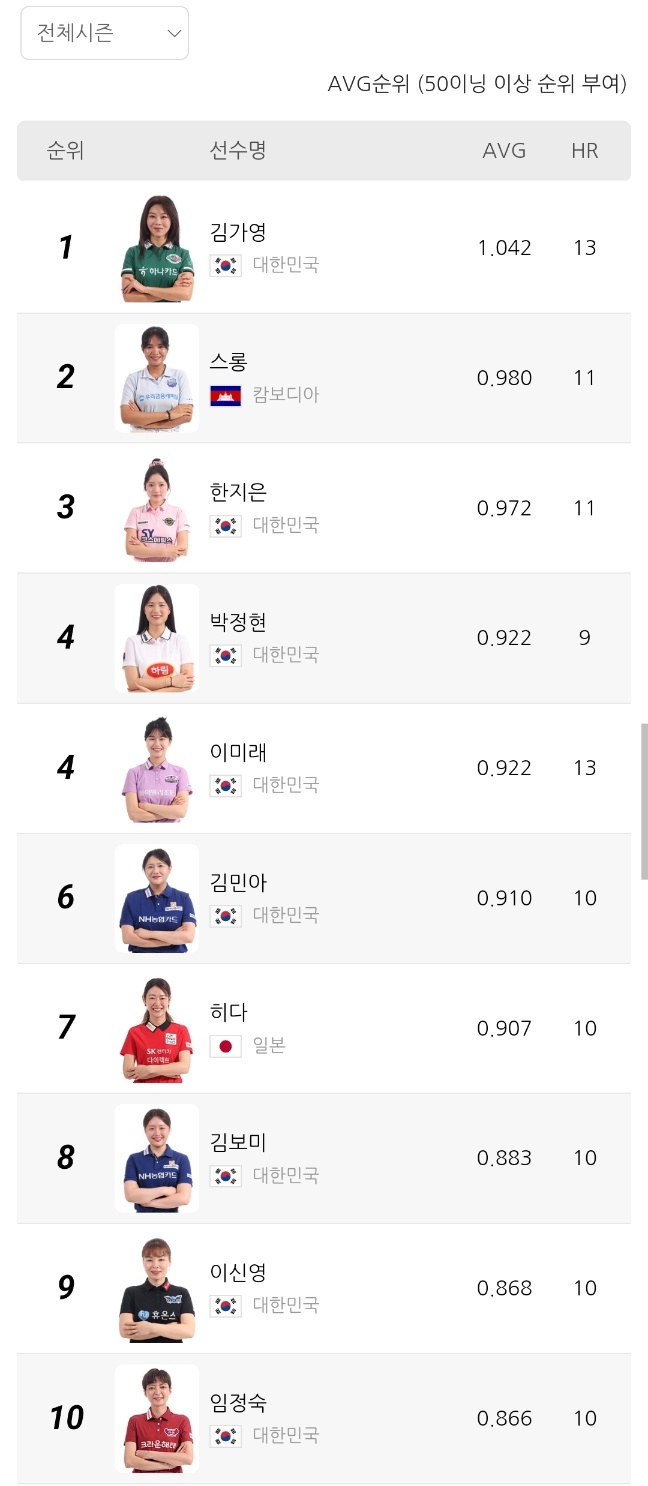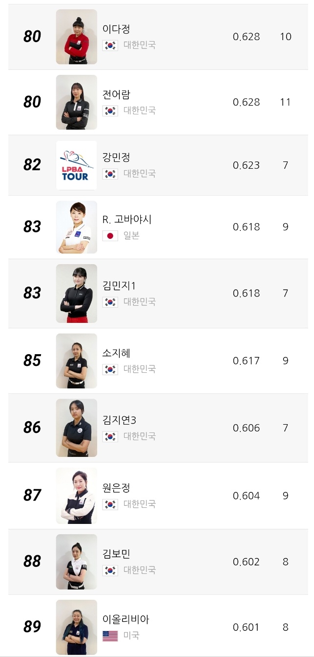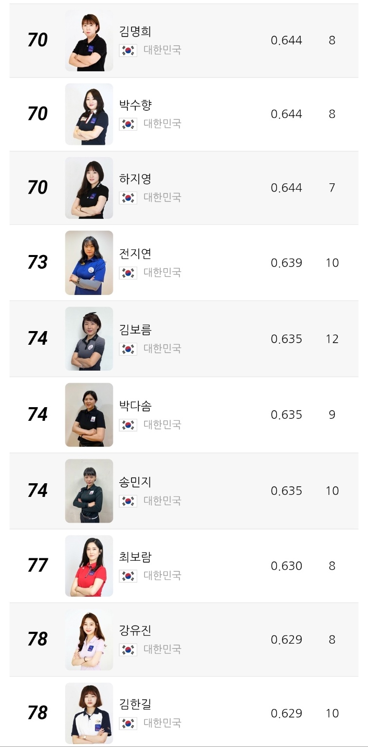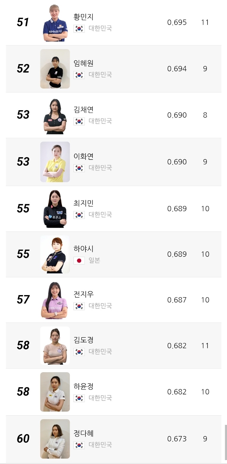 2위는 캄보디아 출신 스롱 피아비 선수로 애버리지 0.980을 기록 중입니다. 한때 UMB 무대를 평정했던 경험이 그대로 반영되듯, 여전히 높은 득점 효율과 안정적인 흐름을 유지하고 있습니다. 3위 한지은 선수는 0.972의 애버리지를 기록하며 한국 선수 중 김가영 다음으로 높은 수치를 보이고 있습니다.