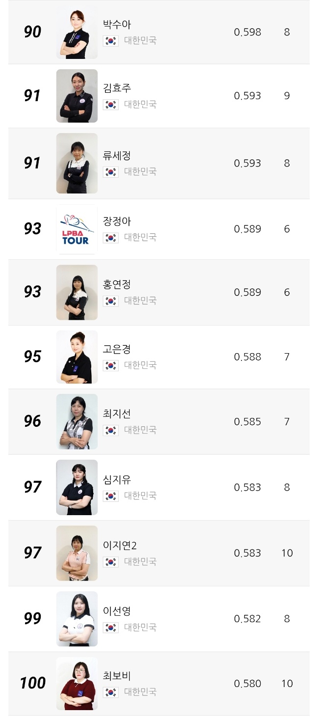 | LPBA 챔피언십 상금 랭킹 TOP10 - 8차 투어 종료기준 (2025-26 시즌) (0) | 2025.12.09 |
