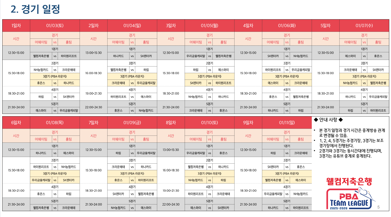 웰컴저축은행 PBA 팀리그 2025-2026 제5라운드는 단순한 정규리그 한 라운드를 넘어, 시즌 전체의 흐름과 포스트시즌 판도를 결정짓는 핵심 무대입니다. 각 팀의 전략, 선수 기용, 한 세트 한 세트의 집중력이 곧 시즌의 성패로 이어지는 만큼, 당구 팬이라면 반드시 주목해야 할 대회라 할 수 있습니다.