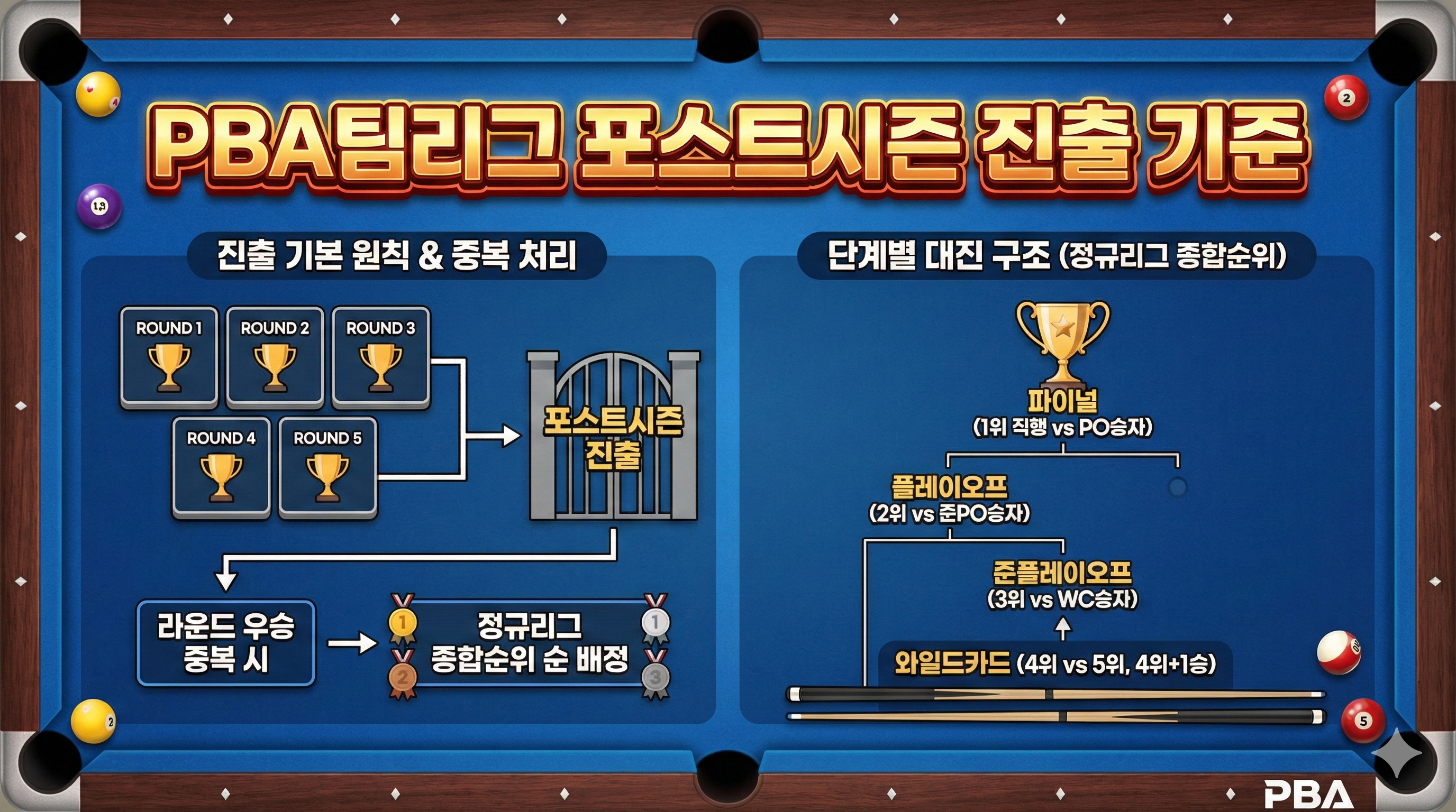 이 글은 웰컴저축은행 PBA 팀리그에서 어떤 팀이 포스트시즌에 진출하는지를 공식 대회요강 기준으로 정리한 안내 글입니다. 정규리그 5개 라운드 운영 방식부터 라운드 우승팀 선정 원칙, 우승팀 중복 시 처리 기준, 그리고 정규리그 종합순위에 따라 결정되는 포스트시즌 대진 구조까지 차분하게 설명드립니다.