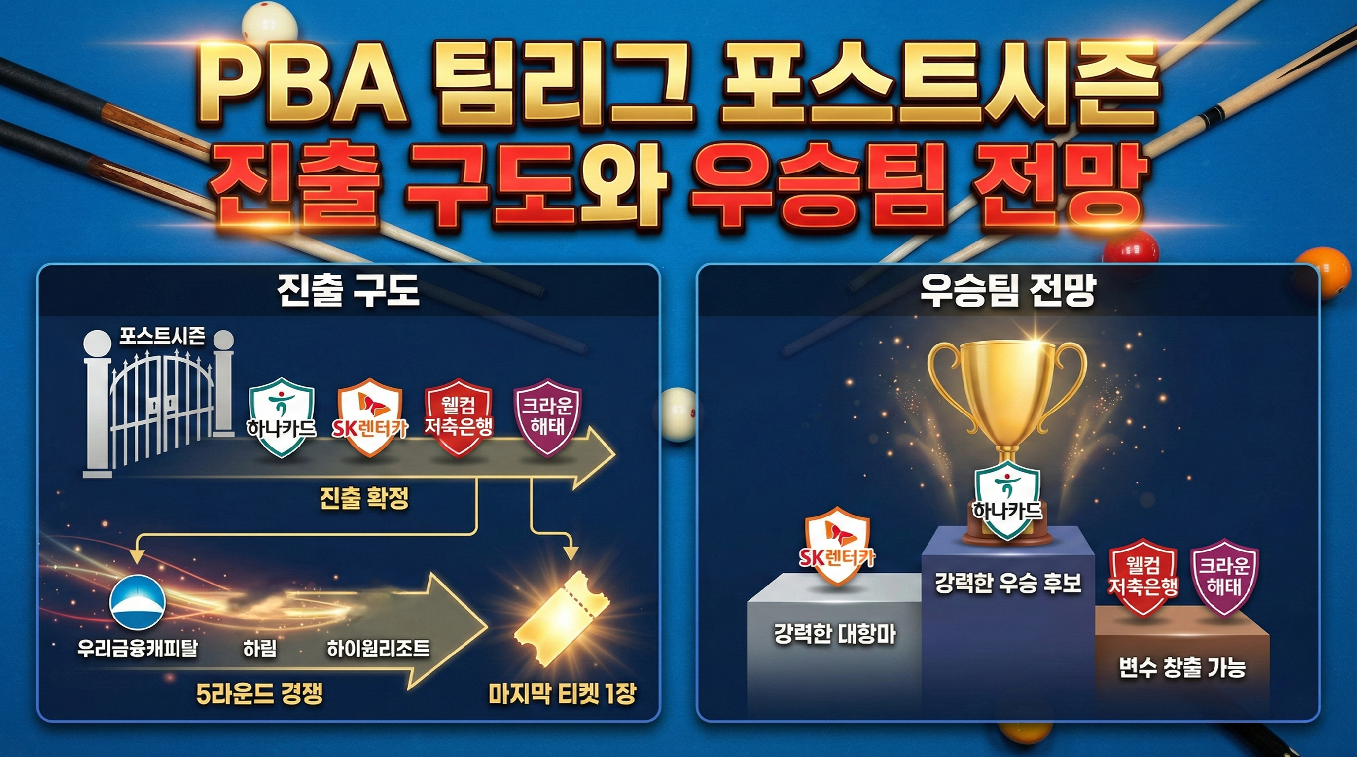 프로당구 2025-2026 시즌 PBA 팀리그 정규리그가 막바지로 접어들면서, 포스트시즌 진출 구도와 우승 경쟁의 윤곽이 점점 또렷해지고 있습니다. 현재 순위표를 보면 상위권과 중위권, 그리고 하위권의 흐름이 명확하게 갈리며, 특히 마지막 남은 포스트시즌 티켓 한 장을 둘러싼 경쟁이 5라운드 최대 관전 포인트로 떠오르고 있습니다. 이 글에서는 정규리그 현재 순위 흐름과 포스트시즌 진출 가능성, 그리고 최종 우승팀 전망까지 차분하게 정리해 보겠습니다.